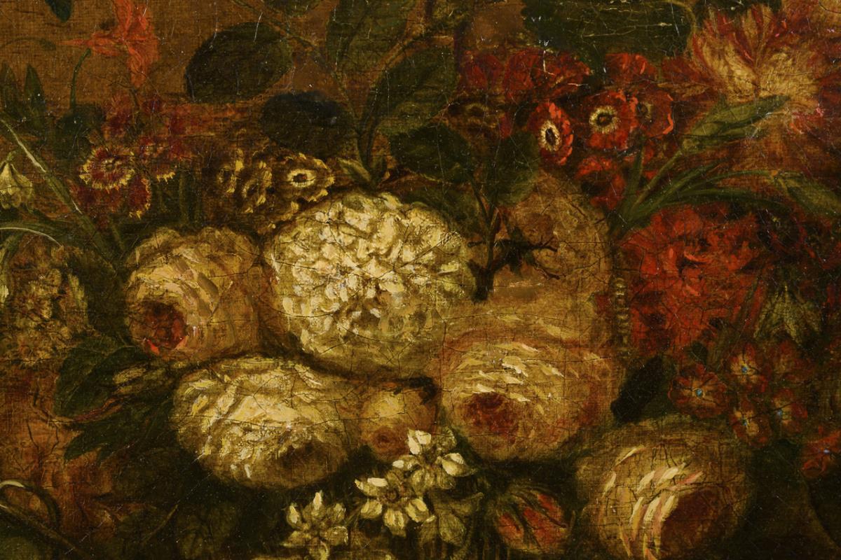 Lush bouquet of flowers with primroses, roses and other plants beside peaches and grapes. Restored with pastedowns, traces of age.