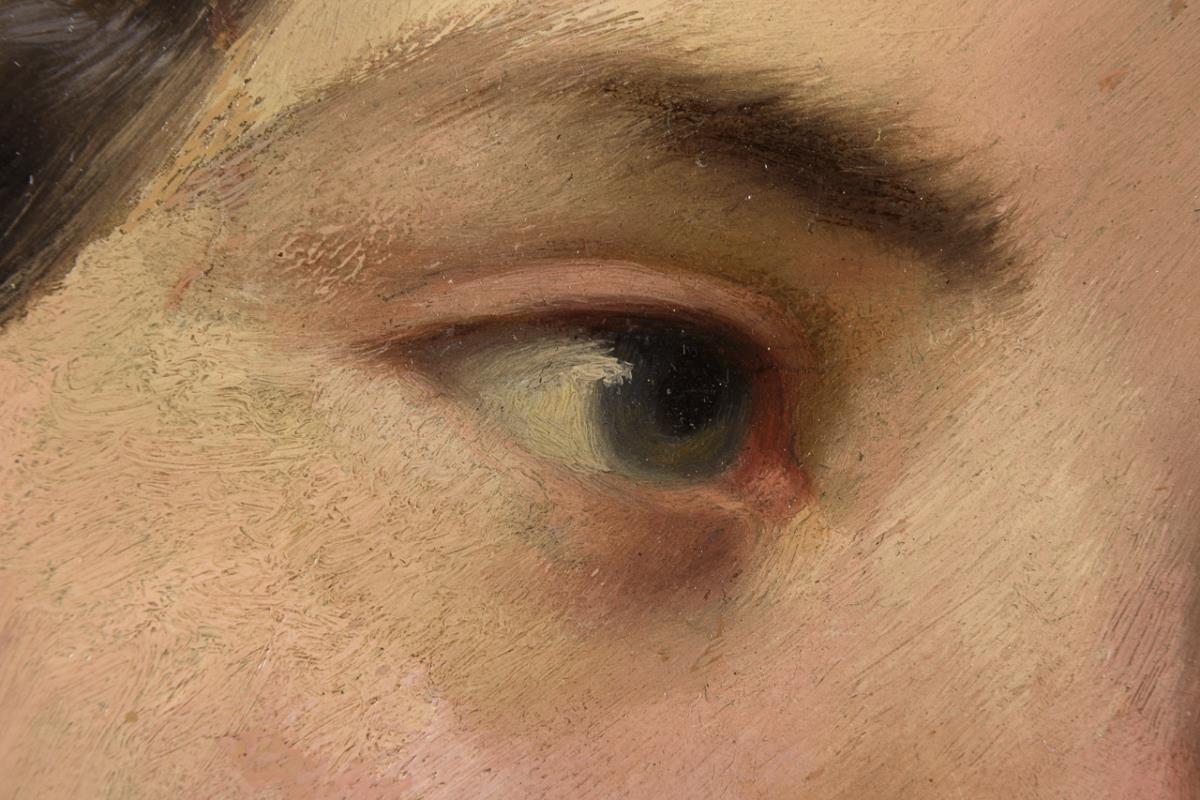 Portrait of a young woman in bright dress and with flowers in her hair. Canvas doubled.