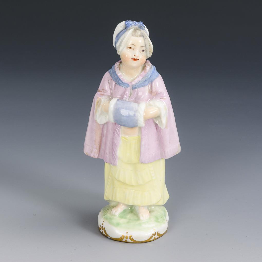 After a model by Johann Joachim Kaendler (1706 Dresden - 1775 Meissen) for the Meissen Porcelain Manufactory, 1750/1755. Standing girl with muff, cape and bonnet. Restoration to the bonnet and cape.