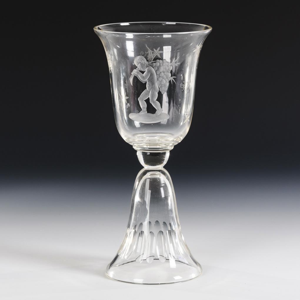 Bell-shaped cup on bell base. Decorated in the style of Michael Powolny with an engraving on the obverse of a putto with large grape.
