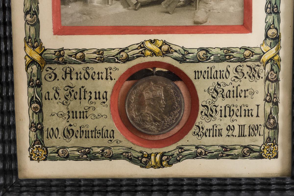 Photo of three soldiers in historicizing costumes with flintlock rifles, medal on black-red-gold ribbon with crowned portrait of the emperor (design Ludwig Christoph Lauer), framing ppt. with inscription for the 100th birthday of the emperor 1897. frame with flame strips.
