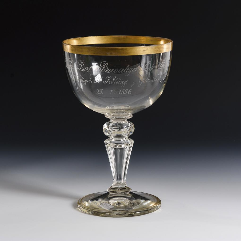 Bellied dome, faceted conical hollow stem with honeycomb-faced nodus, round foot, dislocated finial. On the dome the engraved inscription "Verein Berl. Beer publishers, guest and tavern s / l. Colleagues H. Kölling z Geburtstage 29.7.1896". Gold rubbed.
