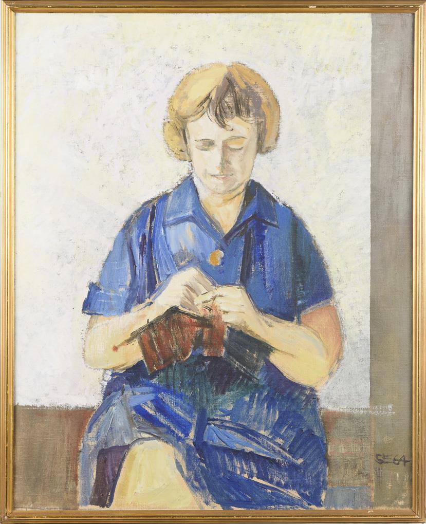 Picture of a woman in blue dress knitting.