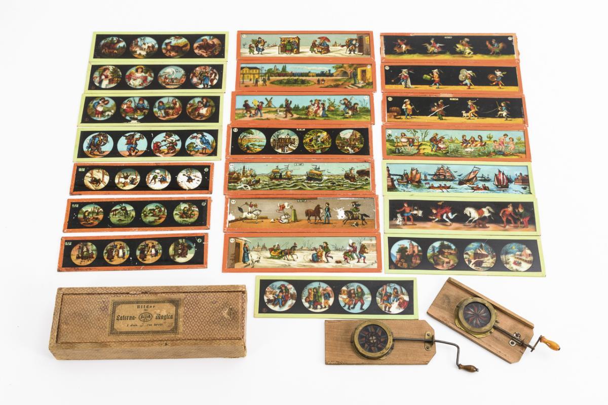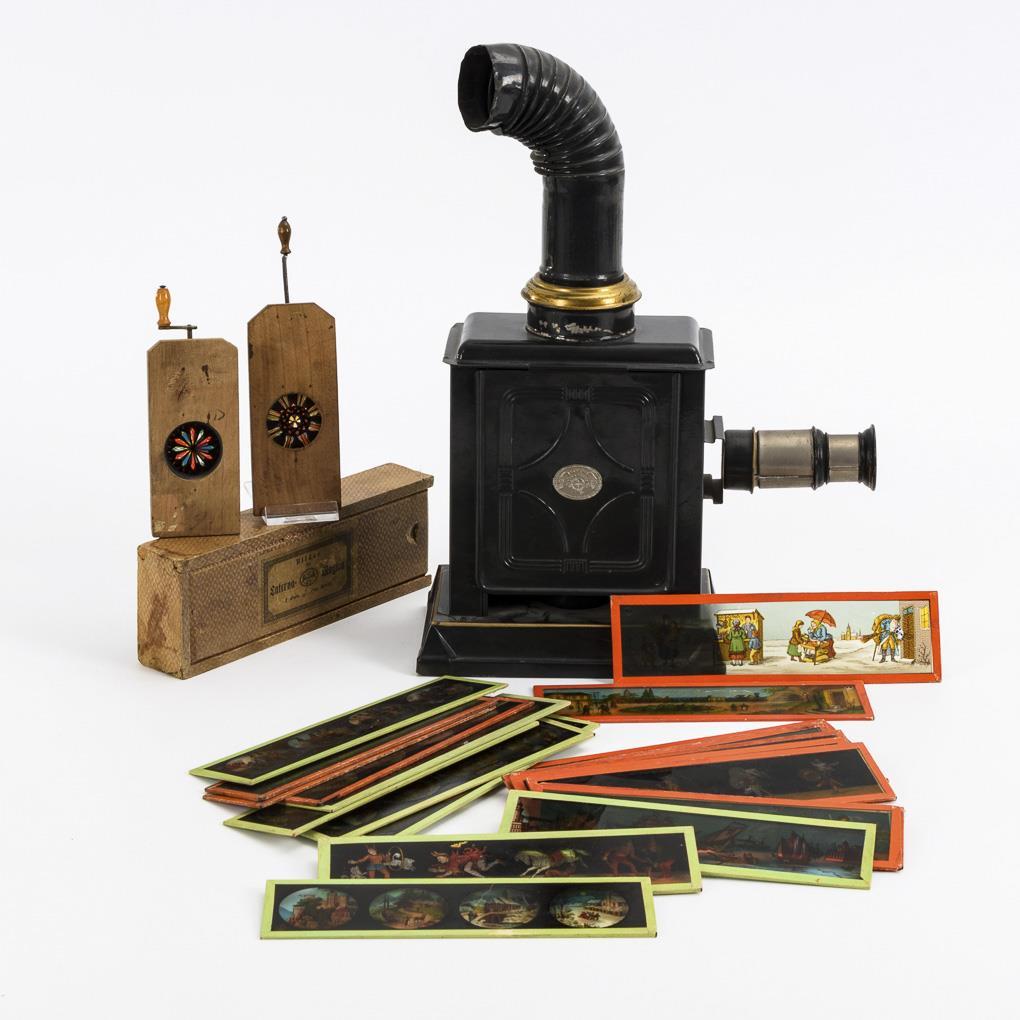 Black tin case with vent and burner. Comes with original box of 8 pictures, 14 loose and 2 moving pictures with hand crank. Slight signs of age.