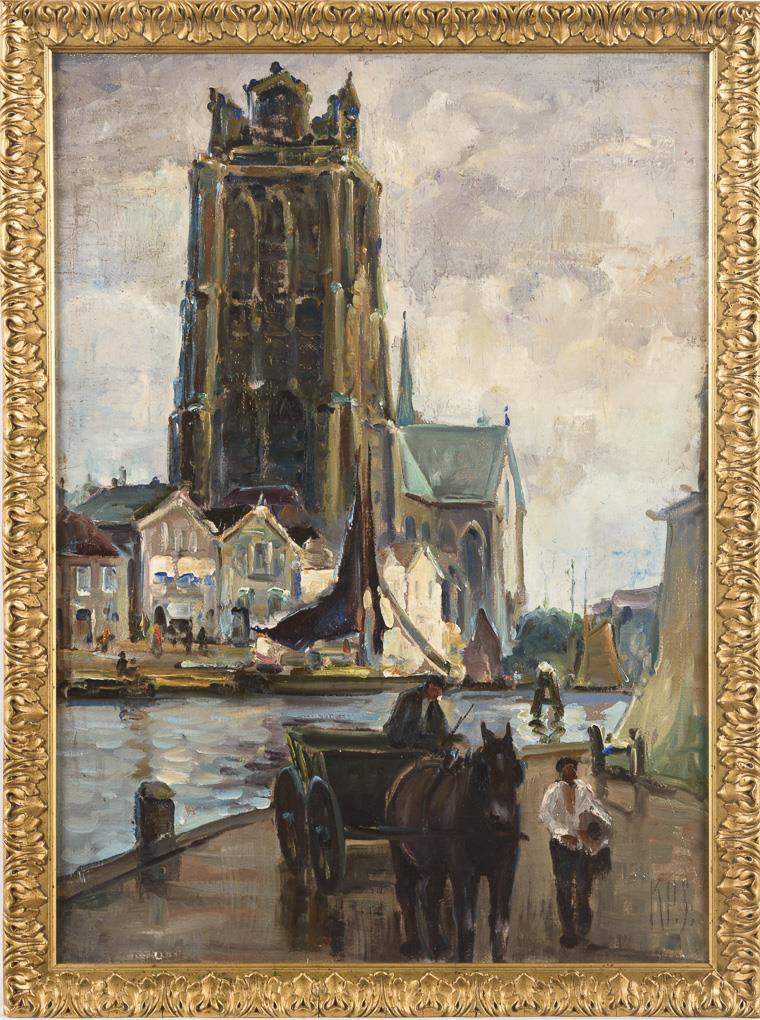 Horse carts at the quay with view to a cathedral under cloudy sky.