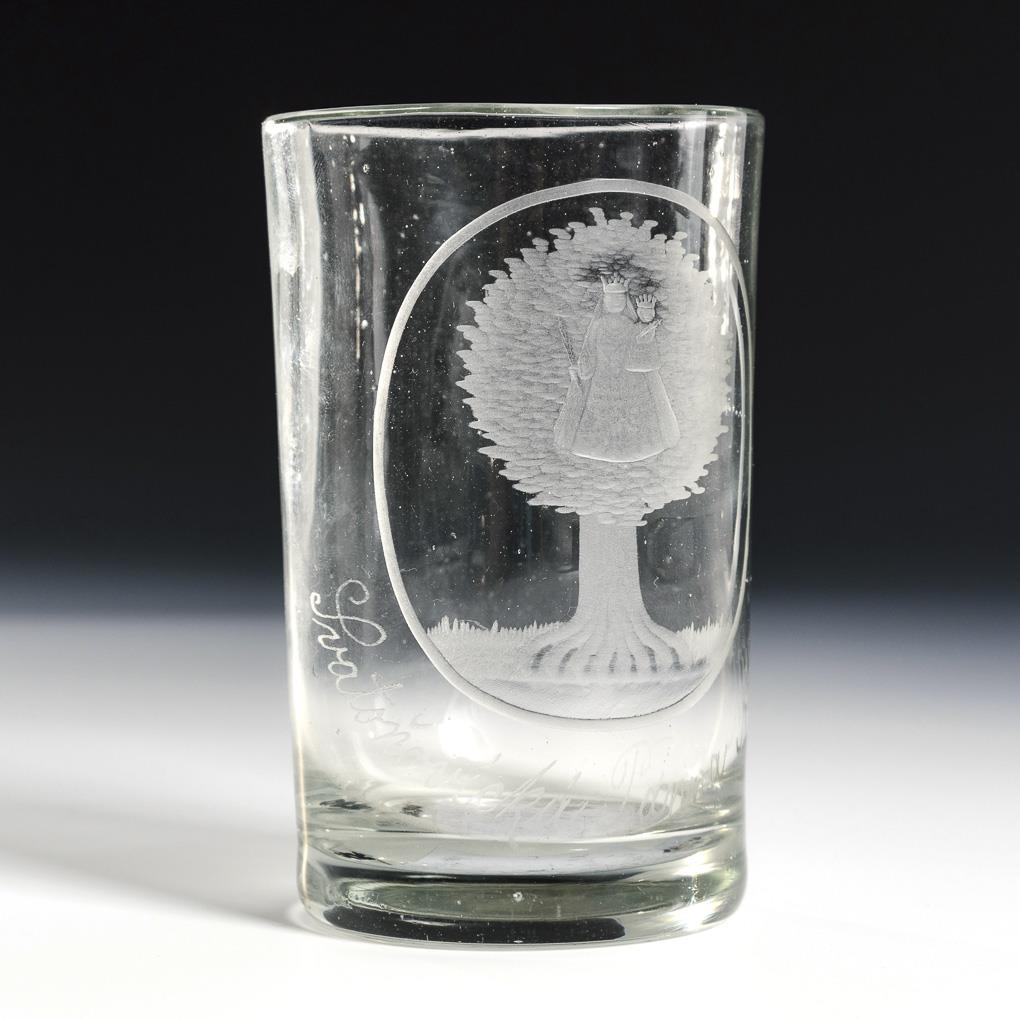 Cylindrical mug 1x with engraved and gold-staffed flowers and the name "Anna Wedralowa" and 1x with the on-screen depiction of a tree with Madonna, inscribed "Svatonovicka Panna Maria." (= cup from the place of pilgrimage Kleinschwadonitz). Gold somewhat rubbed.