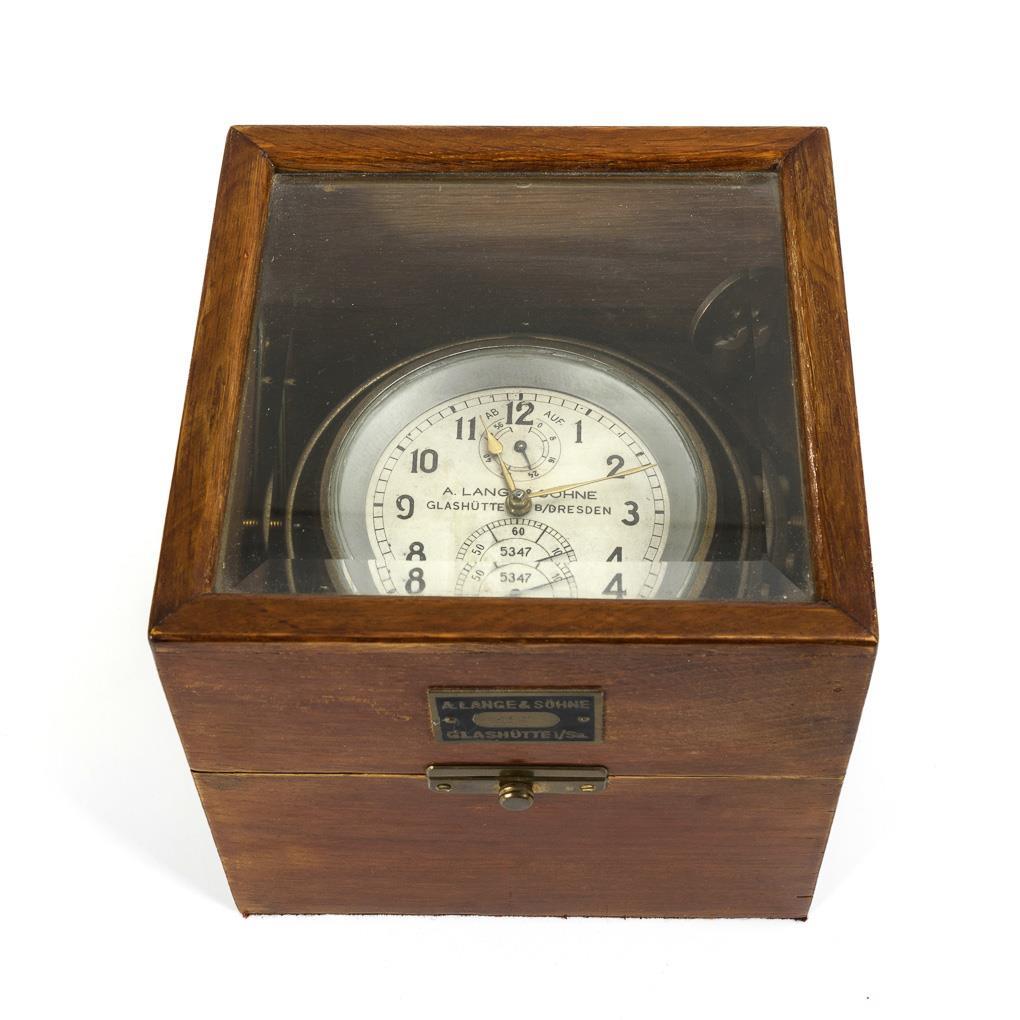 Oak case with faceted glazed hinged lid, side carrying handles. Brass label "A. Lange & Söhne 5347 Glashütte i./Sa.". Ship's chronometer sold on 12.07.1944 to the Deutsche Seewarte Hamburg / Kriegsmarine, Zweigstelle Gesundbrunnen. Slight signs of age and wear.