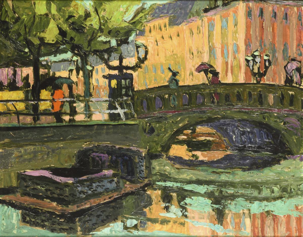 Bridge over a canal with staffage figures and high town houses.