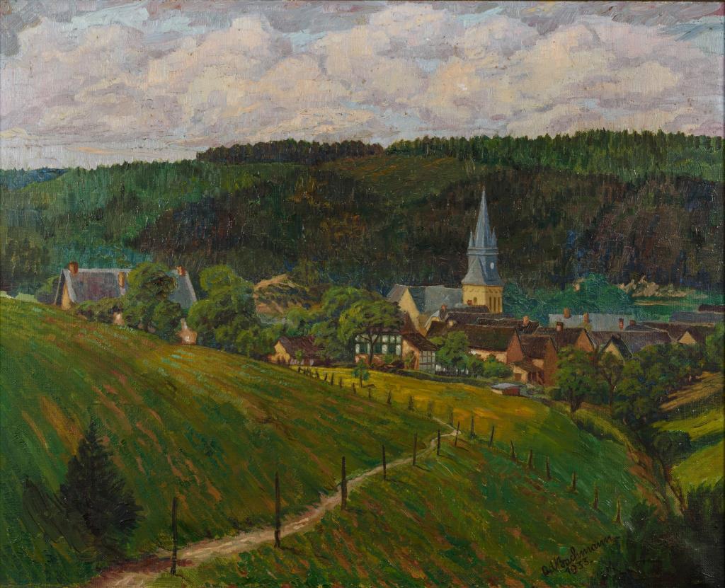 Kleine Ortschaft mit Kirche zwischen Hügeln und Wäldern. Minimale Altersspuren.
