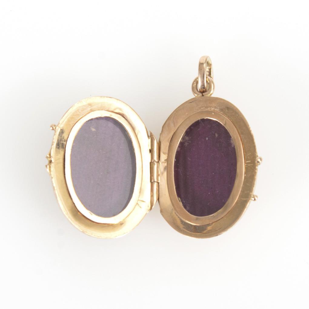 Medallion with pearl trim on the front and floral engraving on the reverse. Glazed framed inner compartments.
