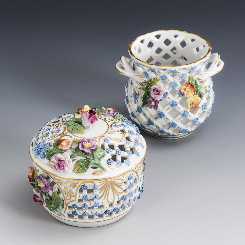 Polychrome painted, gold decorated. H box 9 cm, Ø cachepot 8,5 cm.