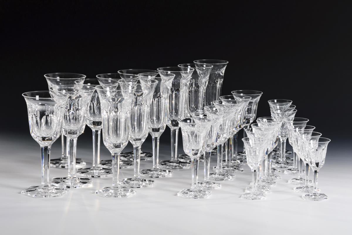 30 pieces. Partially faceted bell cup, faceted stem, hexagonal foot. 6 champagne glasses (H 20,5 cm), 6 wine glasses (H 19 cm), 6 southern wine glasses (H 14,5 cm), 6 liqueur glasses (H 12 cm) and 6 shot glasses (H 11 cm). 1 wine glass with bump at the mouth rim.