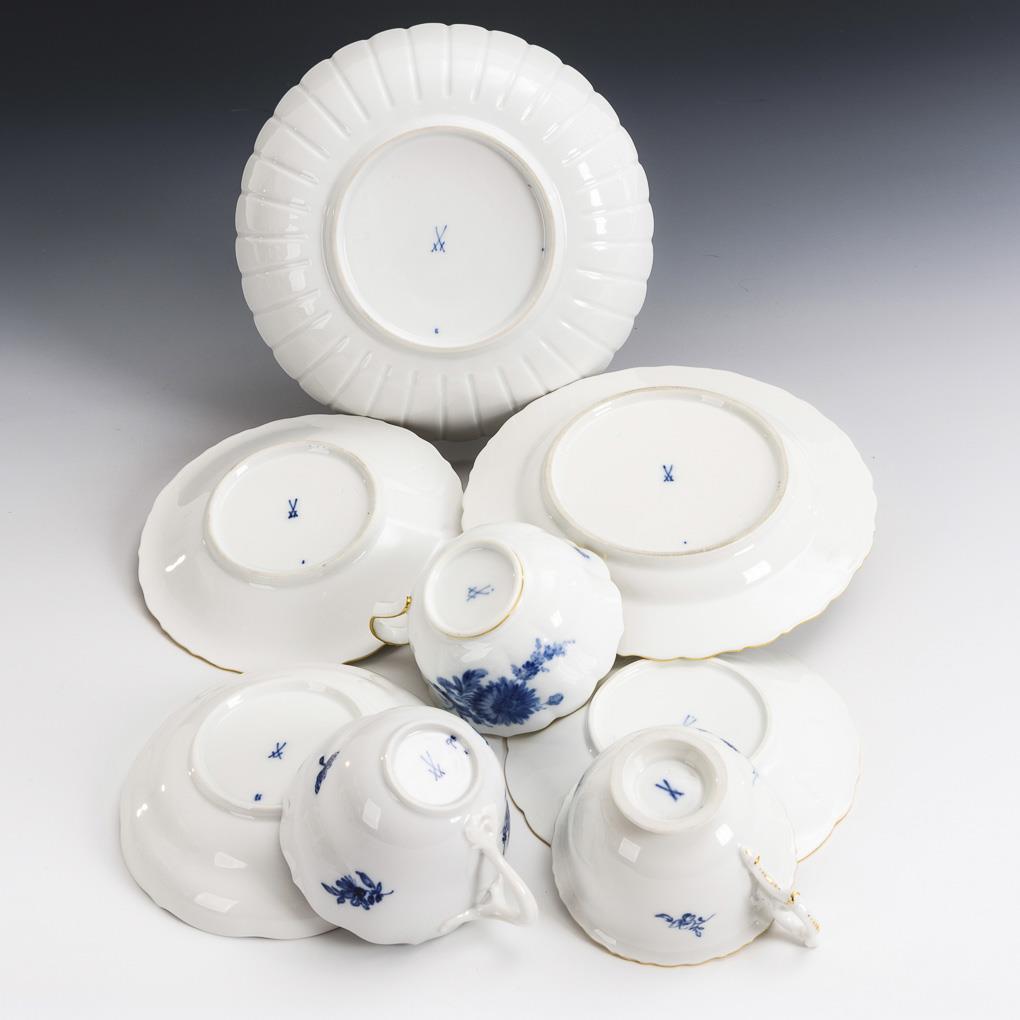 Coffee and tea cup in the form "New Cutout", each with saucer. / Coffee set with rocaillerie rim. / Fan bowl (Ø 20.5 cm).
