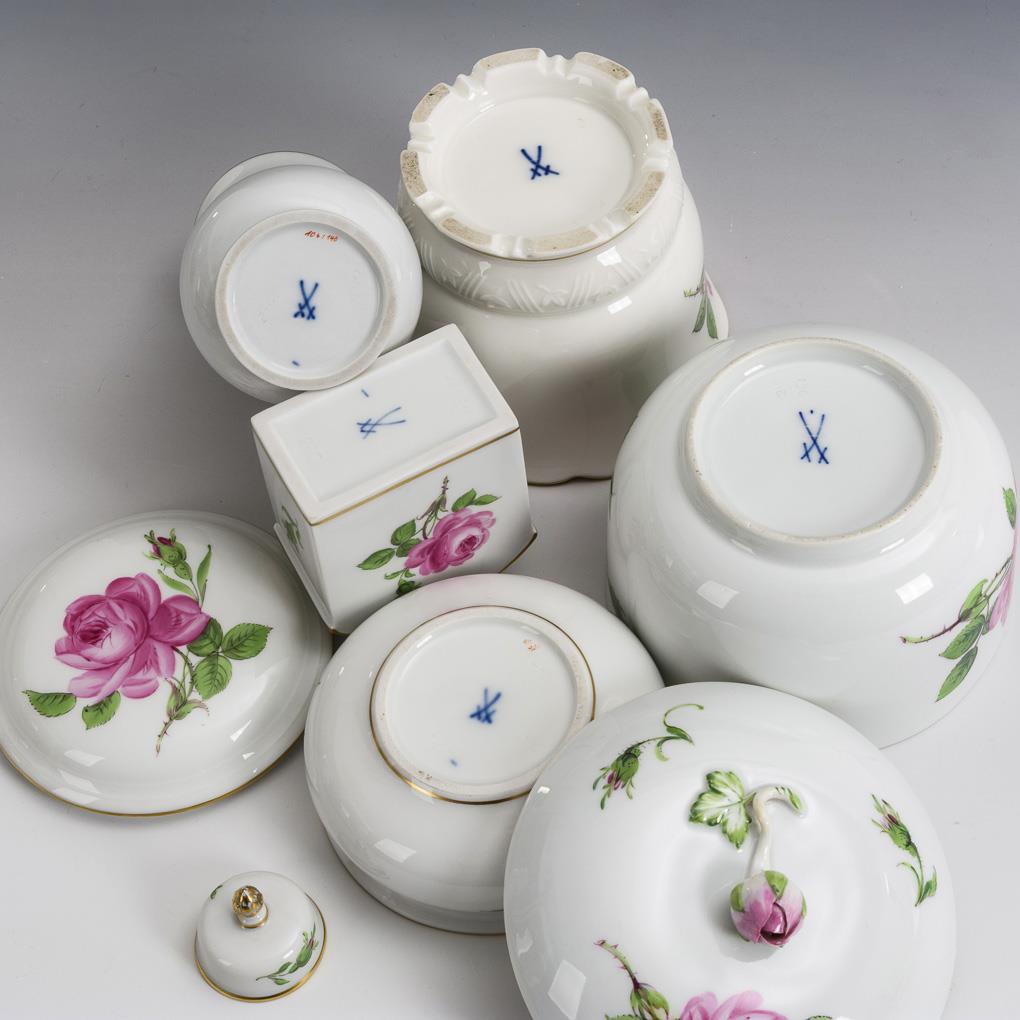 Sugar bowl (h 10,5 cm), vase (h 10,5 cm), cachepot (h 8,5 cm), tea caddy (h 9 cm) and box (h 5,5 cm). Sugar bowl knob bumped.