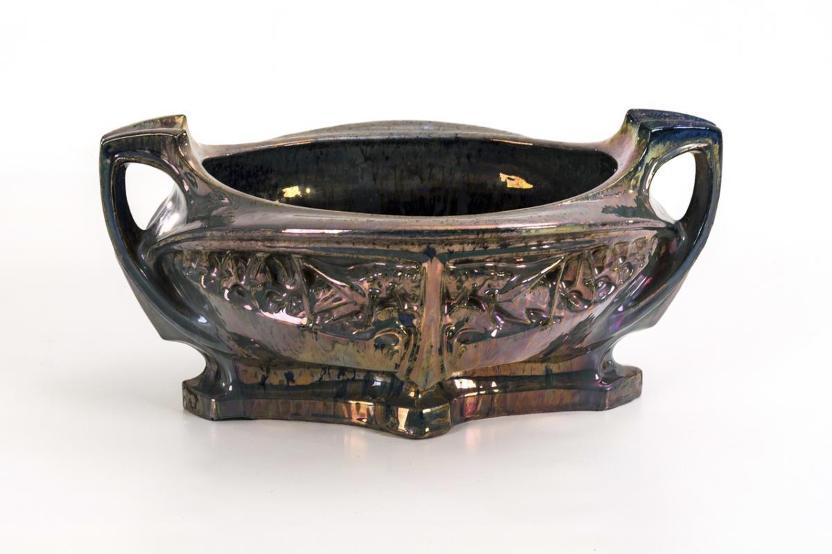 Oval form with 2 handles and 4-pass foot. Flat relief, organically shaped, with grasshopper motifs.