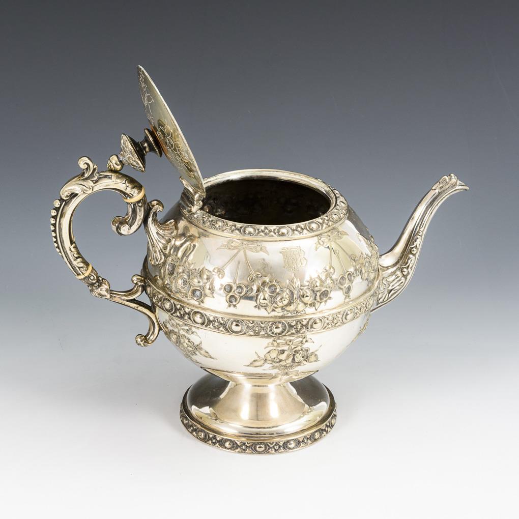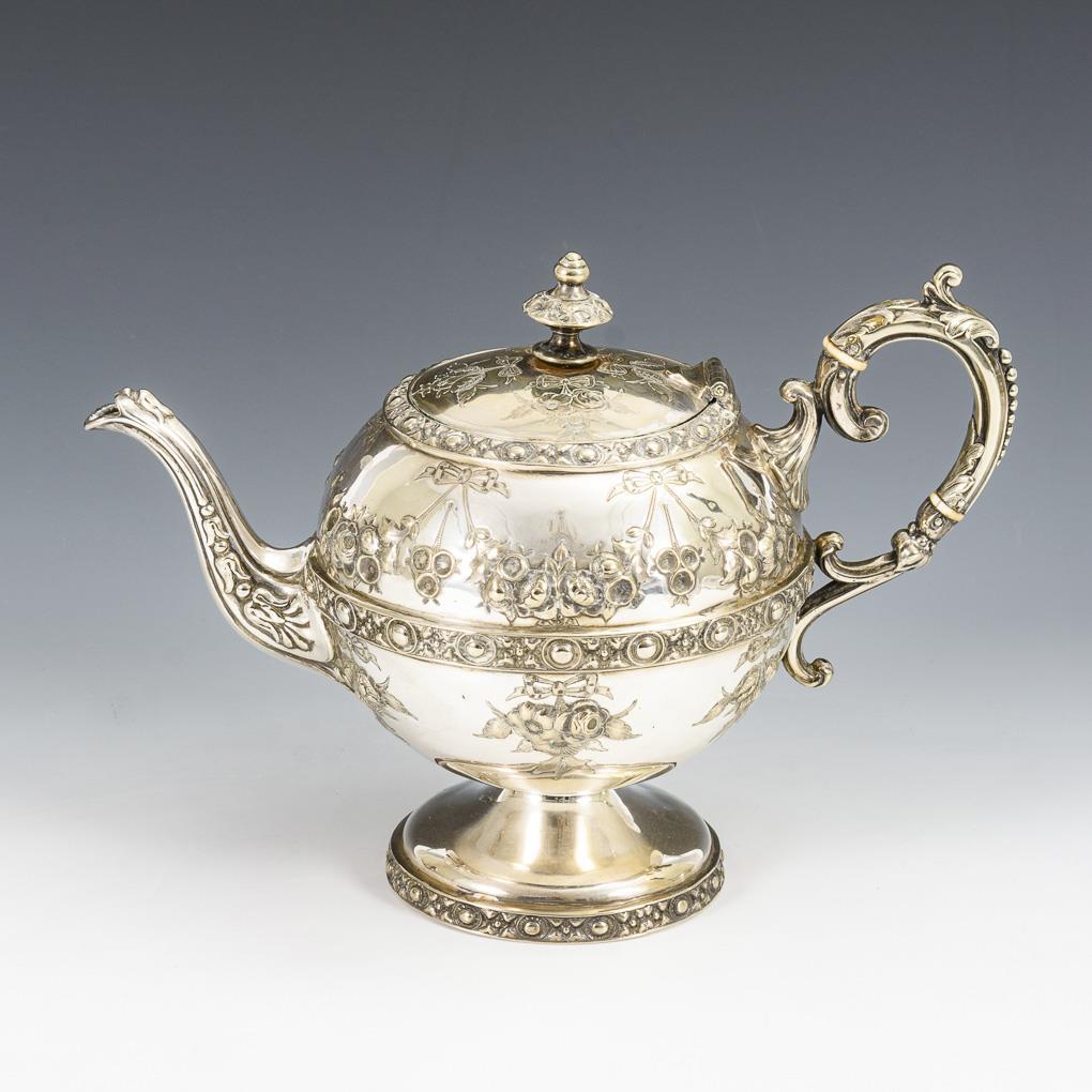 Built form with floral garlands in relief and monogram engraving "FEB": coffee pot, tea pot, sugar bowl and cream jug. Light signs of age and use.