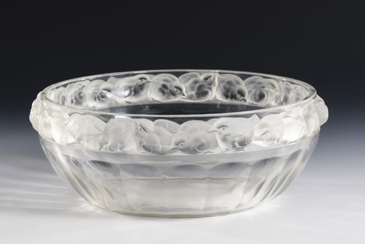 Faceted bowl with a surrounding relief decoration of young titmice.