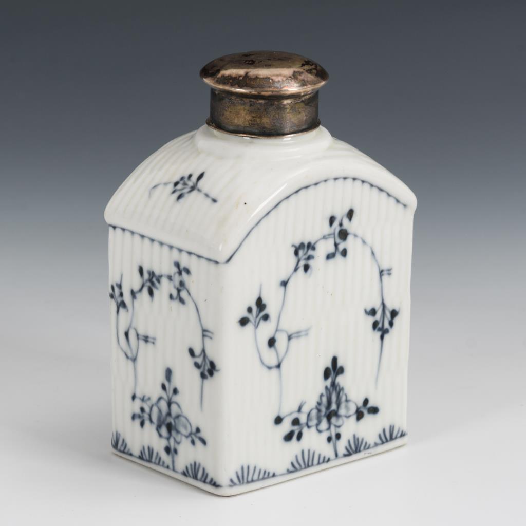 Rechteckige Teedose mit gebrochen gerippter Wandung und ergänztem Silberdeckel. Unterseitig Brandriss.