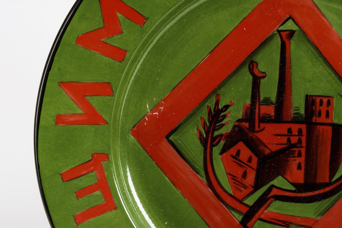 Green background, in the mirror the representation of a factory over ear and sickle, on the flag the Cyrillic slogan "Semlya trudyashimsya" (= "Land for the workers"). Minimal scratch marks in the mirror.