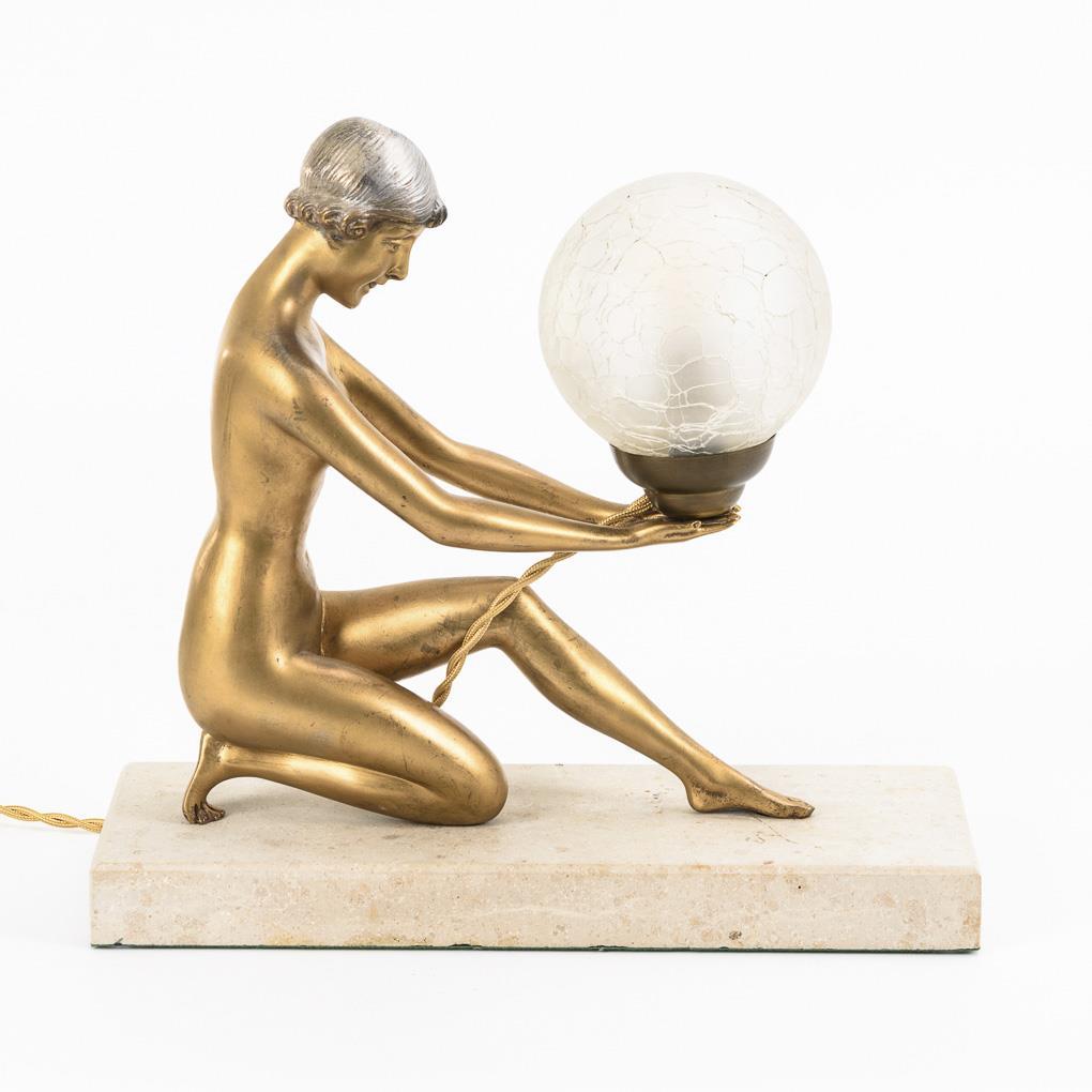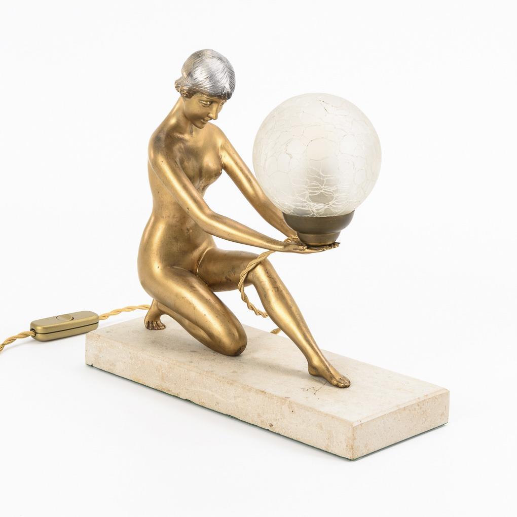 Resembling an expression dancer holding the globe lamp in front of her. Works. Slightly rubbed, wiring renewed.