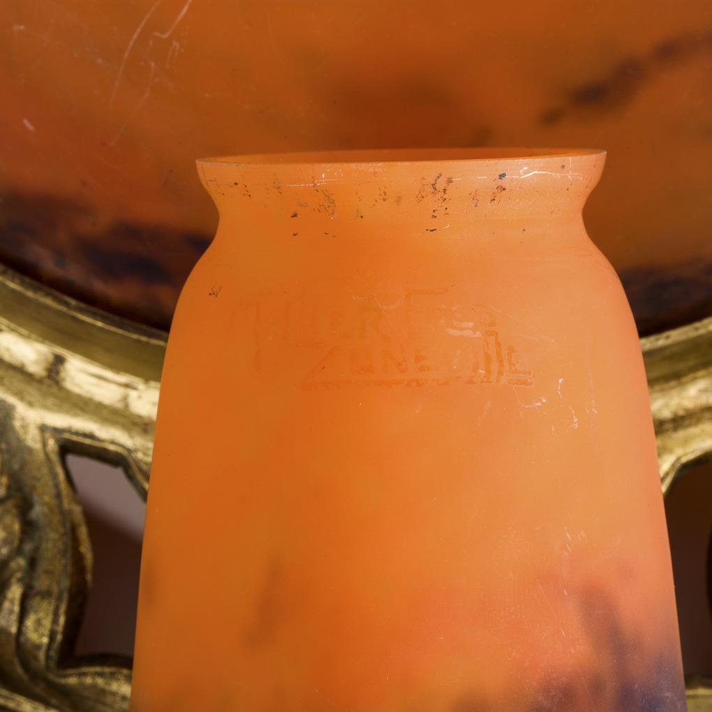 Colourless frosted glass with orange and blue powder fusions, bronze. H approx. 24.5 cm, Ø approx. 67 cm.