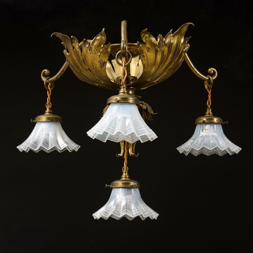 4-lamp hanging lamp with filigree palmette corpus, plate canopy and 3 volute arms with pendant flower-shaped pressed glass shades, central shade on slightly opened lotus blossom. Traces of age/use, lampshades suitably supplemented (?).