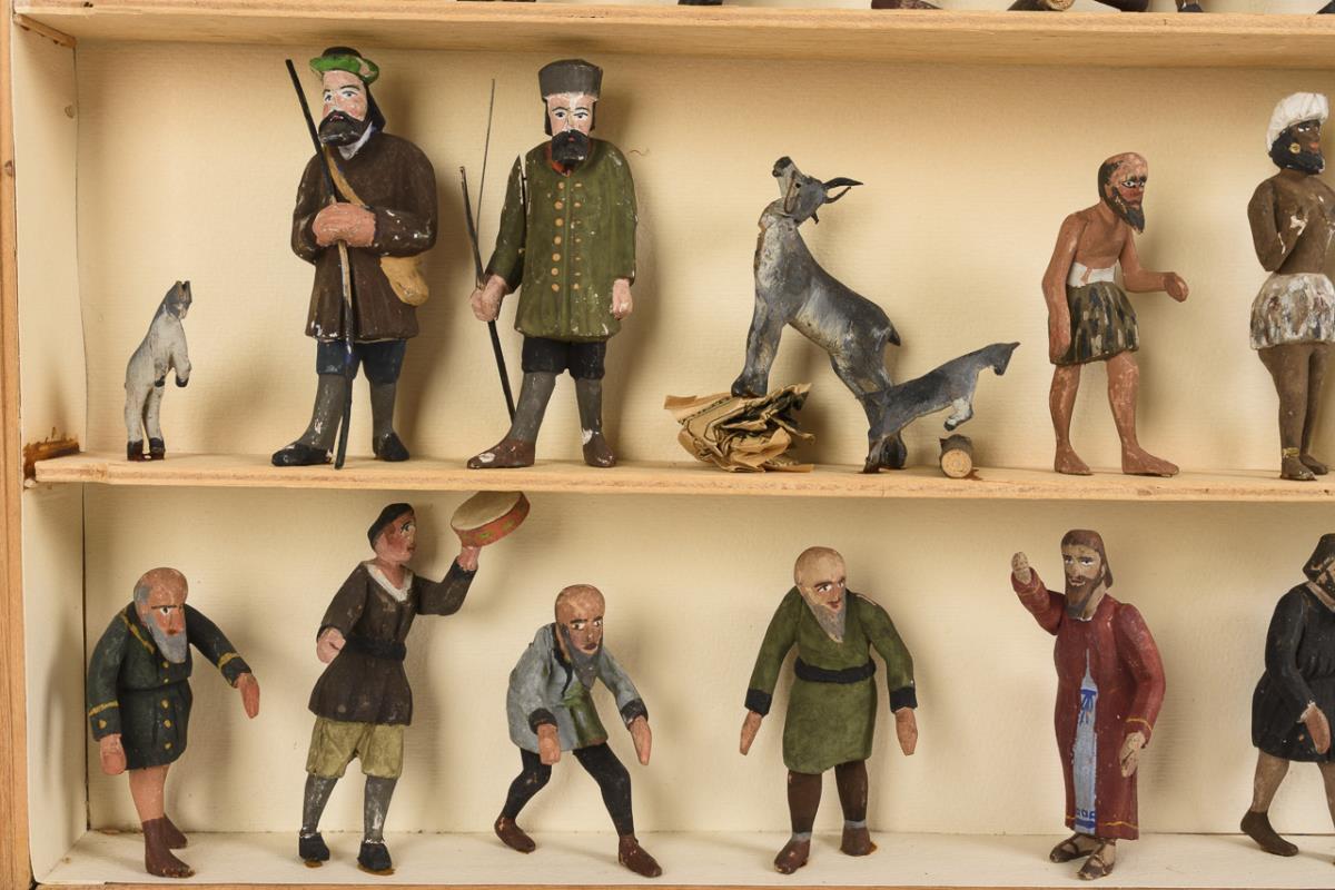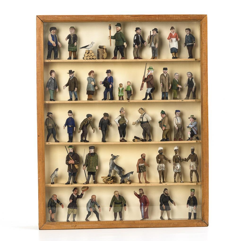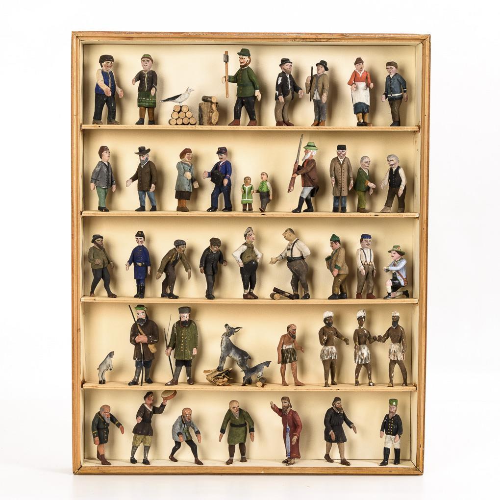Approx. 42 figures, including hunters, woodcutters, goats and 1 miner. In glazed box (60 x 48 x 7 cm). Partly small missing parts and defects.