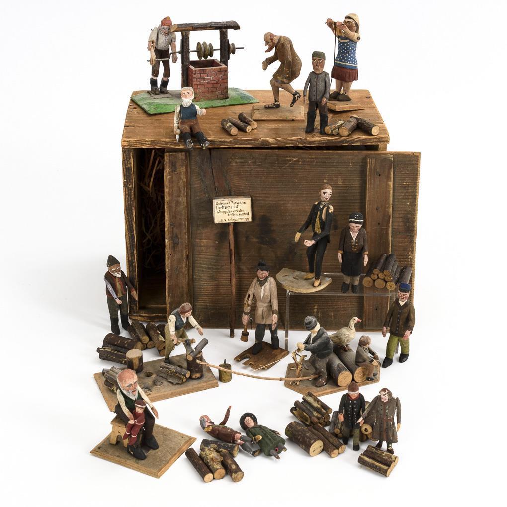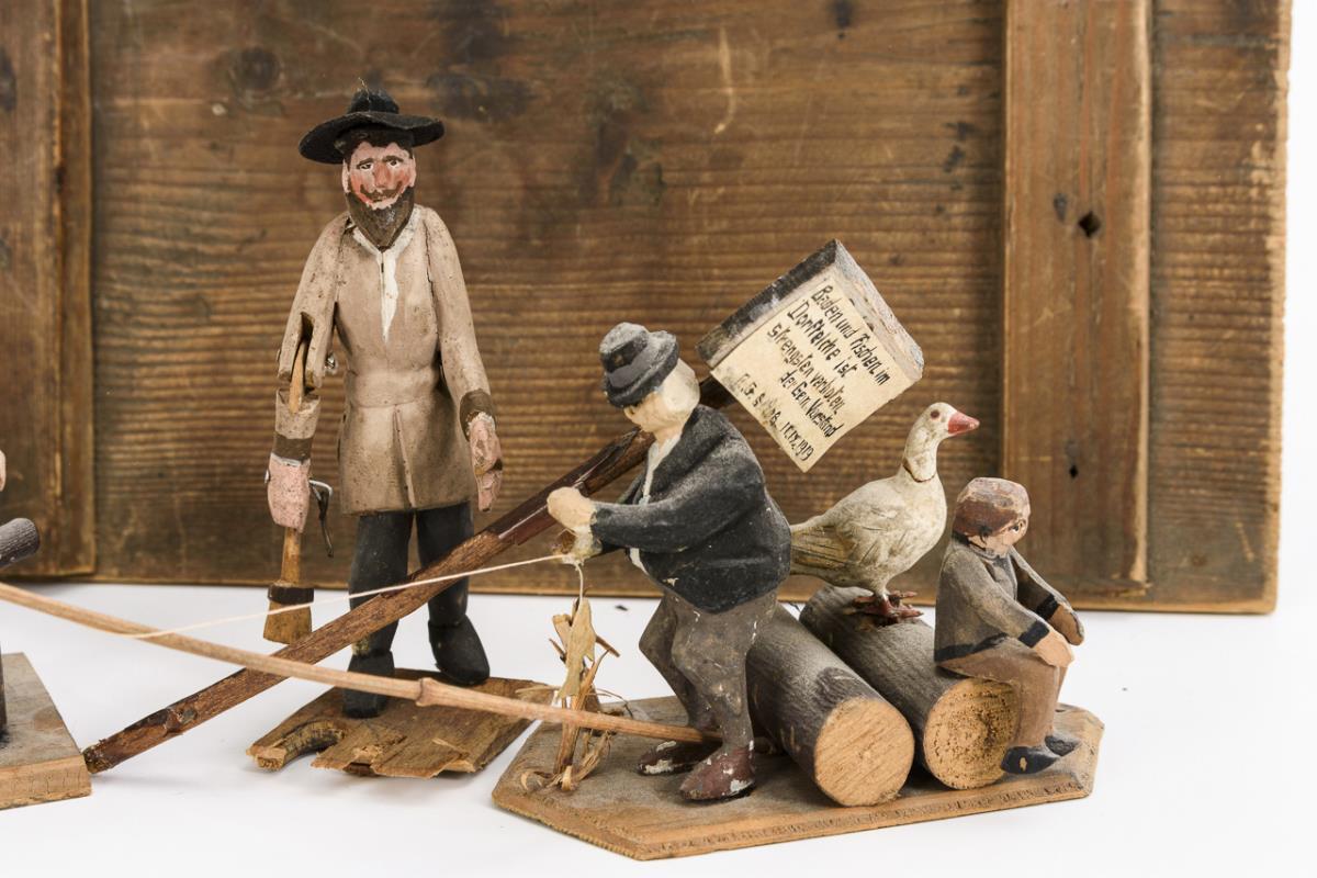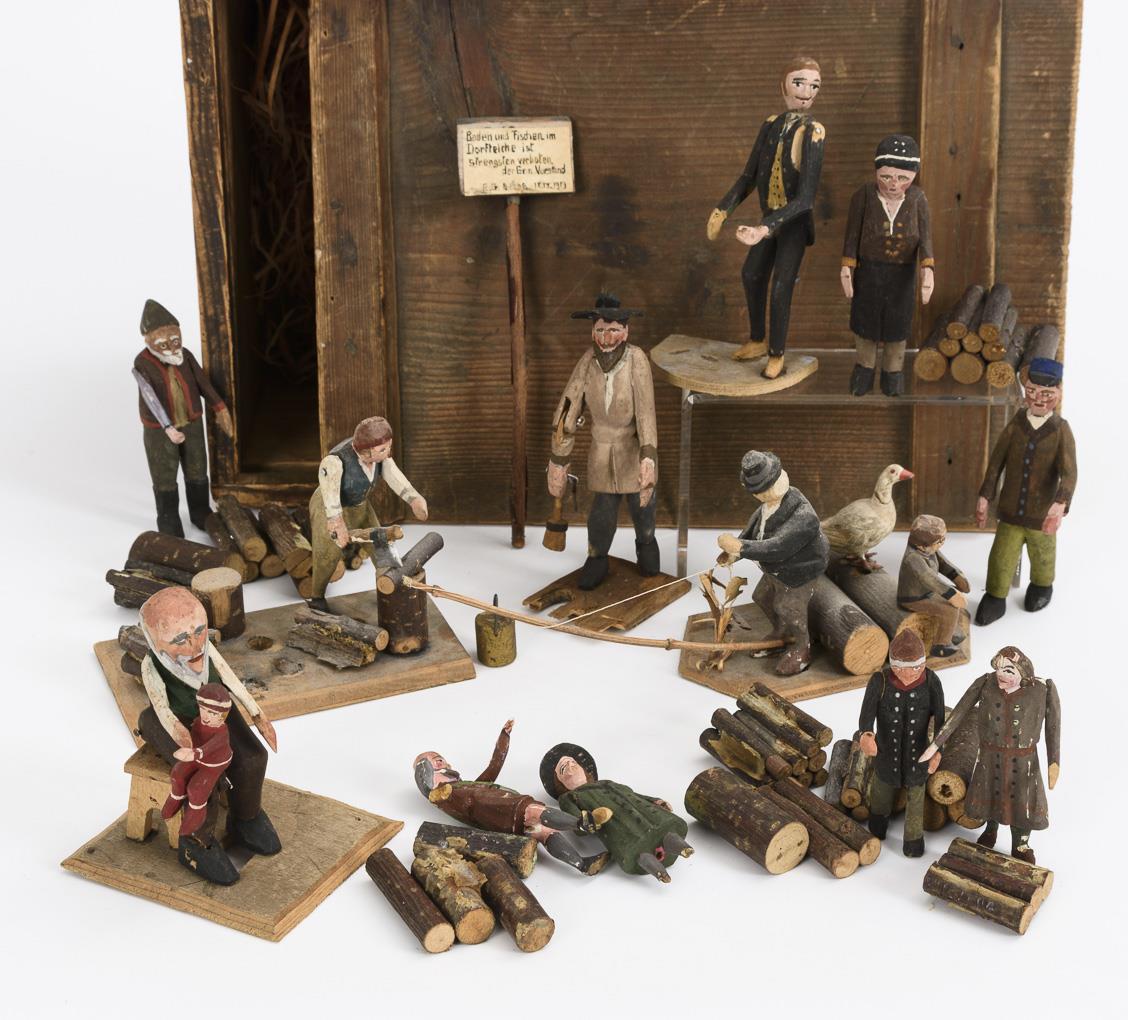 9 movable figures, 8 of them on flat wooden base. Among them: Angler, man at the well, grandfather with child, woodcutter. In addition 8 single figures and numerous logs. In old wooden box. Traces of age and defects.