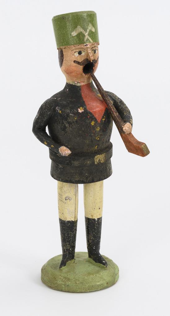Smoking man with bread cigars as miner in uniform. In large old box. Signs of age and use.