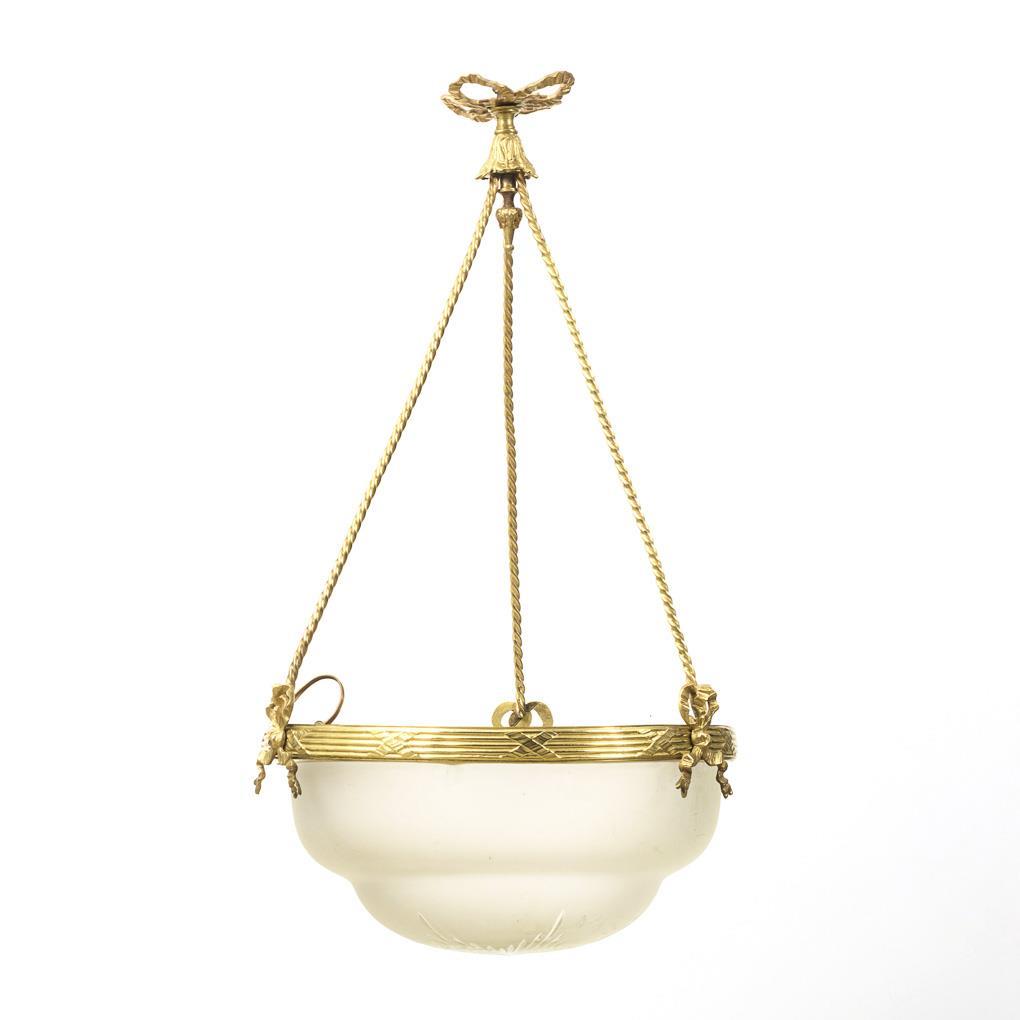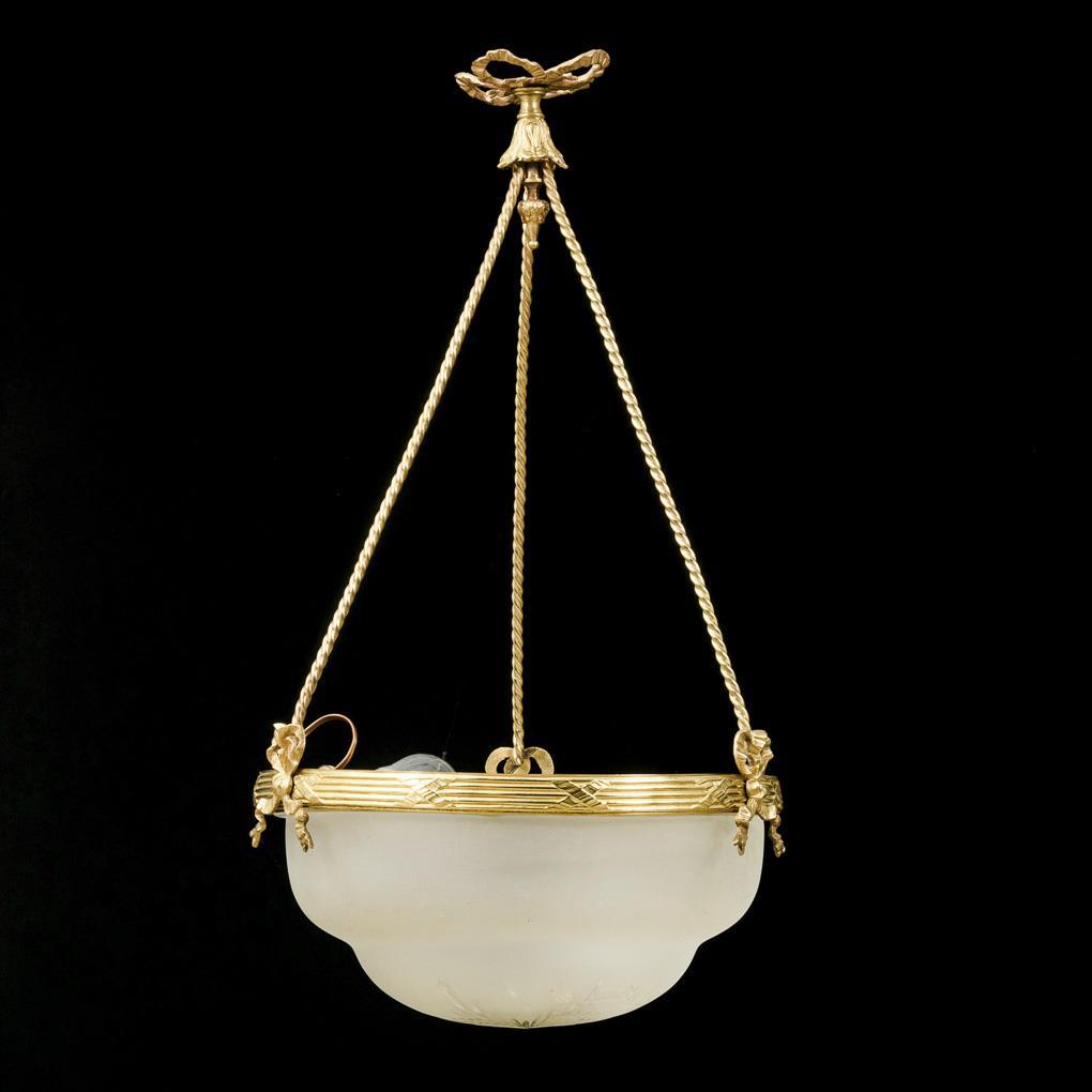 1-light hanging lamp on 3-fold chain suspension with bow decoration and à jour worked canopy, in bronze wreath with antique decor inserted glass bowl with notched cut. Signs of age/use, glass bowl with bumps on the rim.