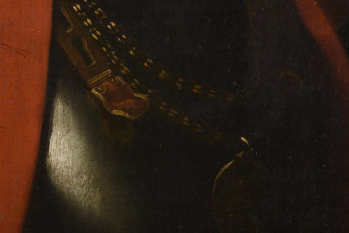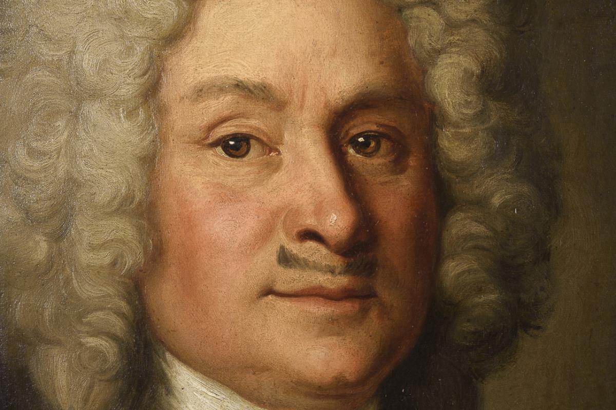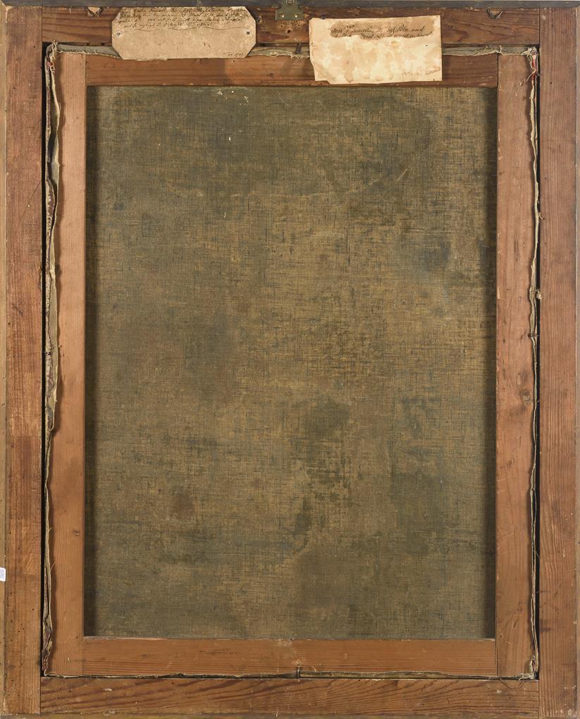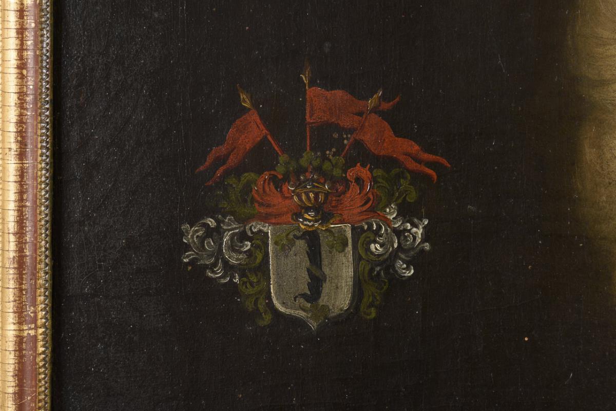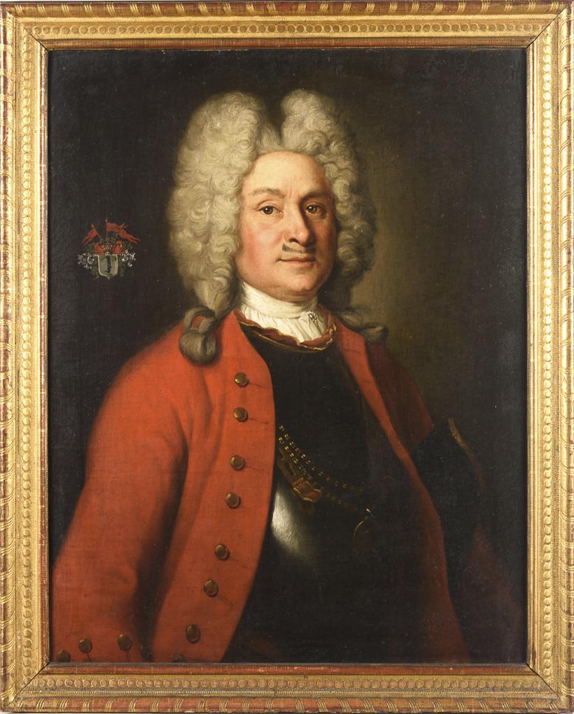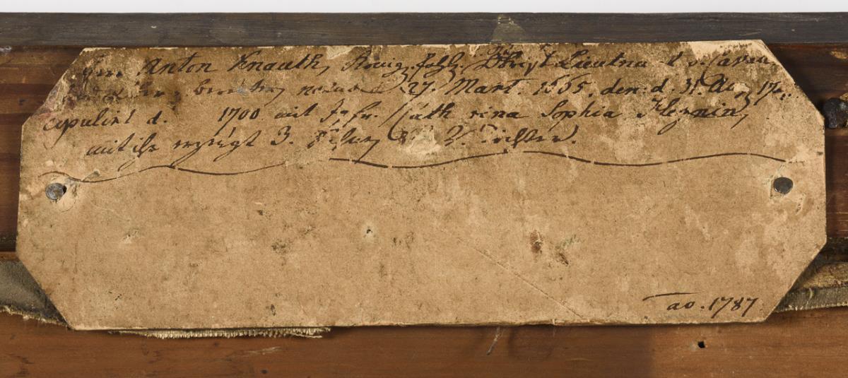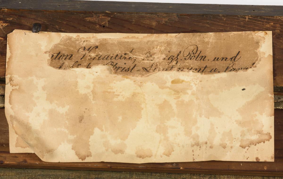 Oil/canvas. Unsigned, handwritten title on slip of paper on verso: "Anton Knauth, Koenigl. Poln. Obrist Leutnant d. Cavallerie (...)(natur) d. 27. Mart: 1665, den 31. Aug. 17 (...) copulirt d. (...) 1700 with Jgfr. Catharina Sophia Heynin, with her produced 3 sons u. (...) daughters/ao. 1787". 1st h. 18th c.