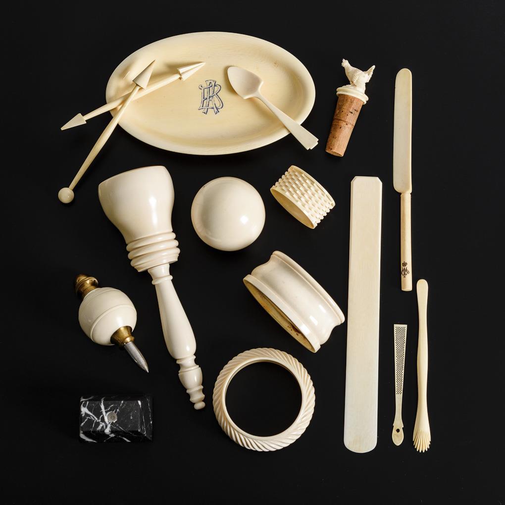 Masonic symbols: Knüpfel, plumb bob and modelling tools(?). Billiard ball. Oval bowl engraved with monogram "BA"; threaded hole on underside. 2 bangles and 1 napkin ring. 1 side turner. 1 knife (monogram engraving "MM" under crown) and 1 spoon. 1 capercaillie as cork crown. 1 decorative element. Plus 1 marble base. breakout at threaded hole.