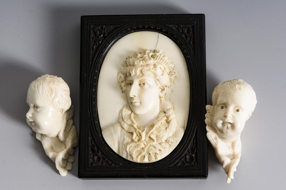 Convolute ivory: 1 portrait in ebony frame + 2 putti heads.