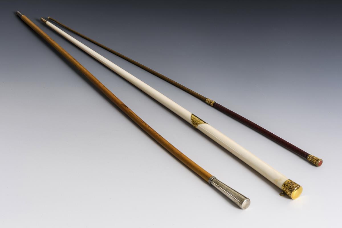 Ivory and gold (checked). / Flanging staff with silver pommel (crescent/crown/800/yy). / Crop with brass mount and carnelian. L maximum 63 cm.