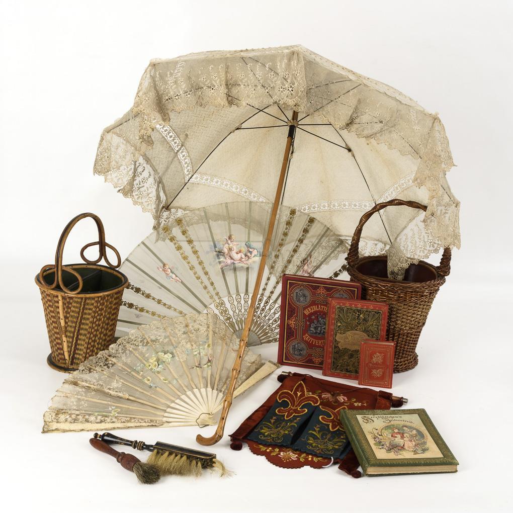 Shade with wooden stick, 2 handle baskets, 2 folding compartments (leg and plastic, painted gauze), 1 brush wall holder with hand brush and brush, 4 books (2 vols. Herzblättchens Zeitvertreib, Der Jungfrau Leben-Lieben-Leiden, Christliches Vergissmeinnicht). 1 leg rod broken, 1 gauze torn, traces of eating on the holder, mostly signs of age/use.