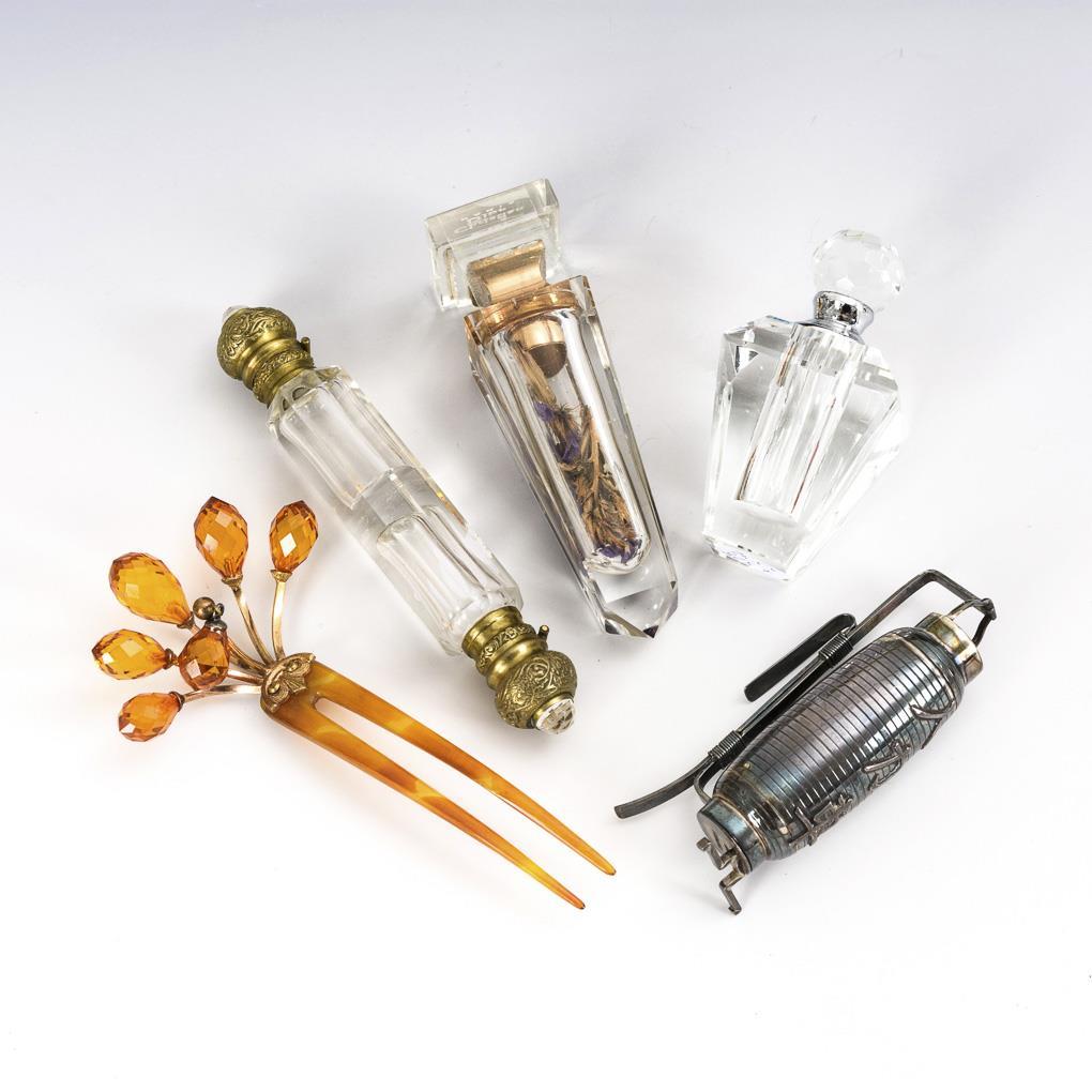 Double flacon with glass stoppers under hinged lids, obelisk flacon (originally for lipstick) and flacon with screw top. Shaker with characters. Hairpin made of tortoiseshell with faceted amber beads.