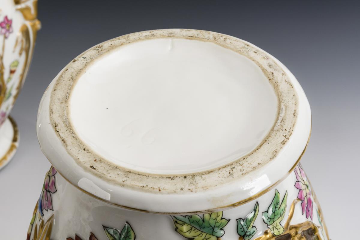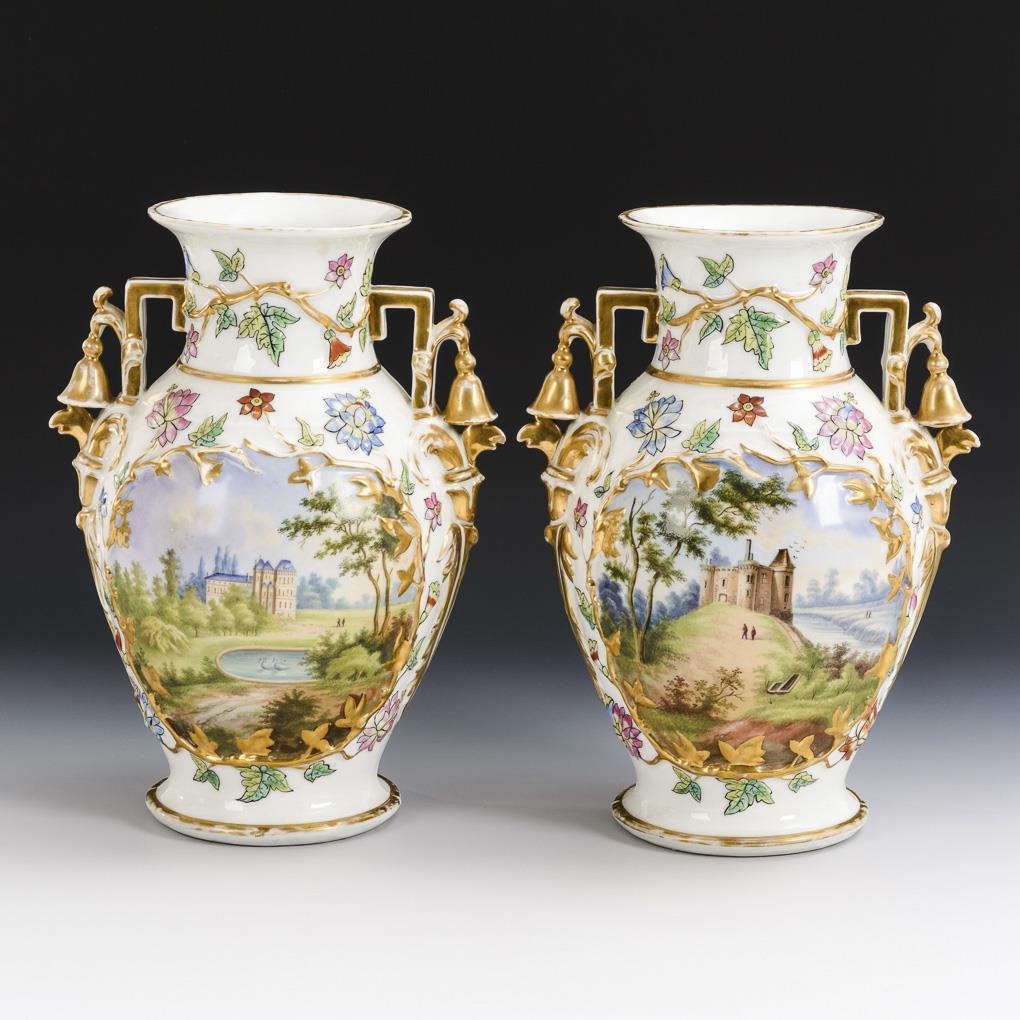 Baluster vases with angled handles and floral relief. On both sides a cartouche depicting a river landscape with architecture and staffage. Gold rubbed.