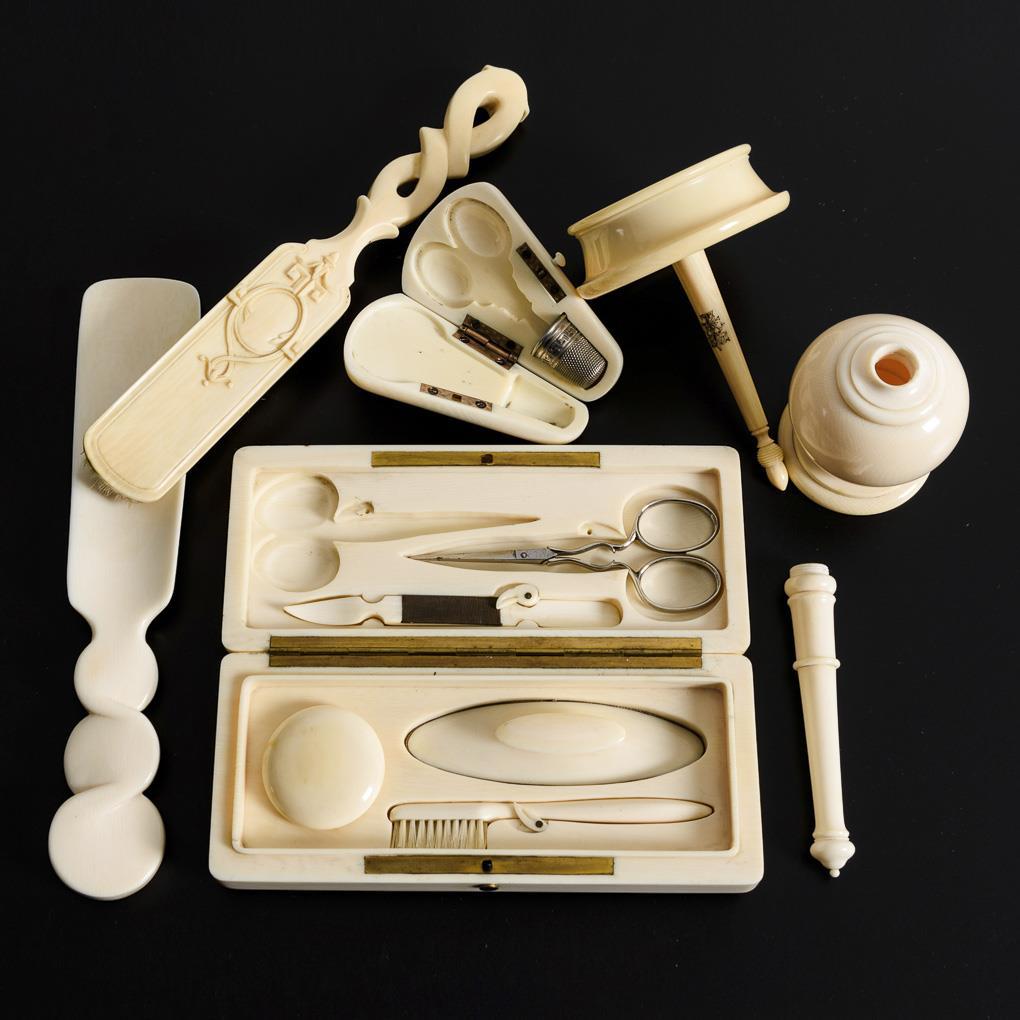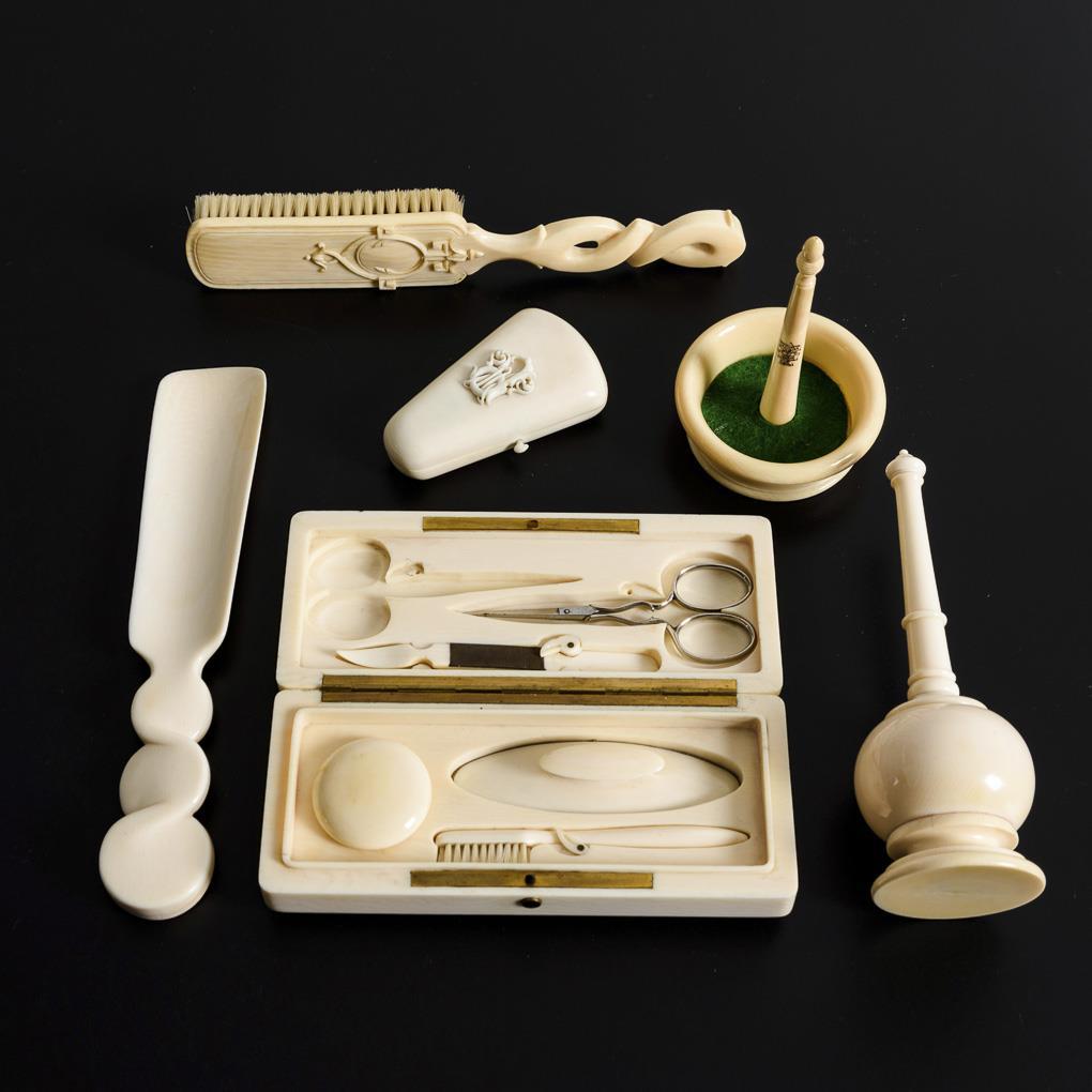 Massive necessaire casket for nail care, small sewing necessaire with applied monogram "PM" and silver thimble. Hairbrush with empty cartridge. Shoehorn. 2 stands as ring holders; 1x engraved with Masonic symbols(?). 2 scissors missing, 1 added, 2 arrestors loosely attached.
