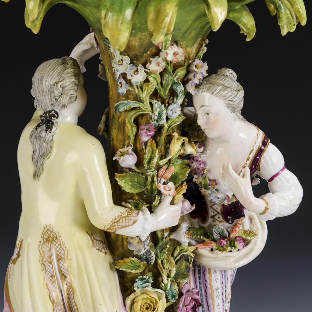 Pair of gardeners on a palm shaft, on top a breakthrough basket. Bottom hairline crack in the base, bumps on the covering, palm leaves partially restored, gold somewhat rubbed.