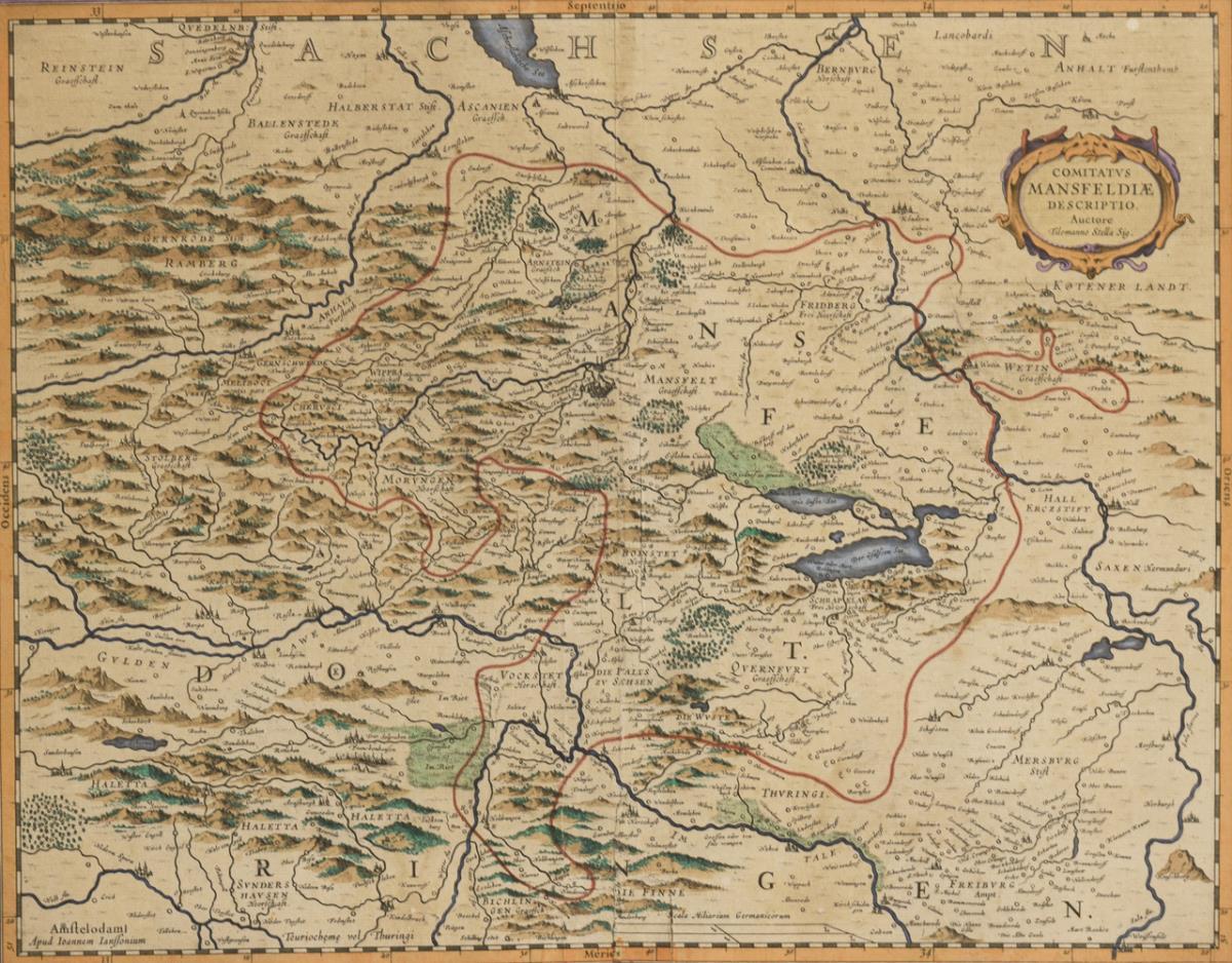 Detailed historical map of the Mansfeld area in the Harz foreland, with title-cartouche "Comitatvs Mansfeldiae Descriptio. Auctore Tilemanno Stella sig.", after a drawing by Tilemann Stella (1525 - 1589). Bow crease with tear, tear at lower margin, some foxing and soiling.