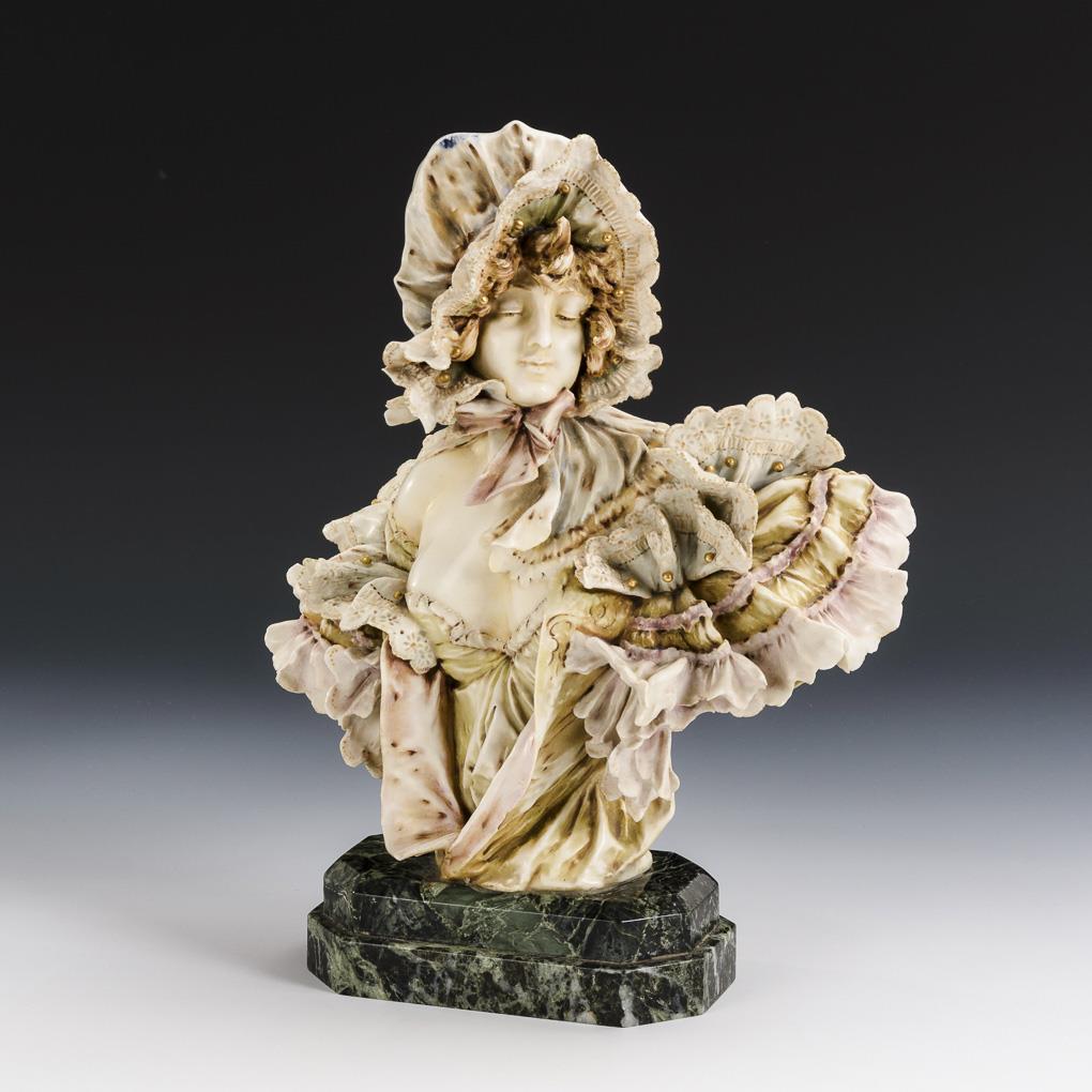 Bust of a young lady in opulent frilled dress, on stone base. 2 bumps to the frills.