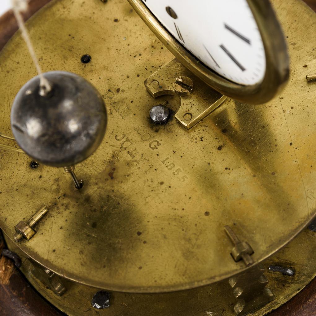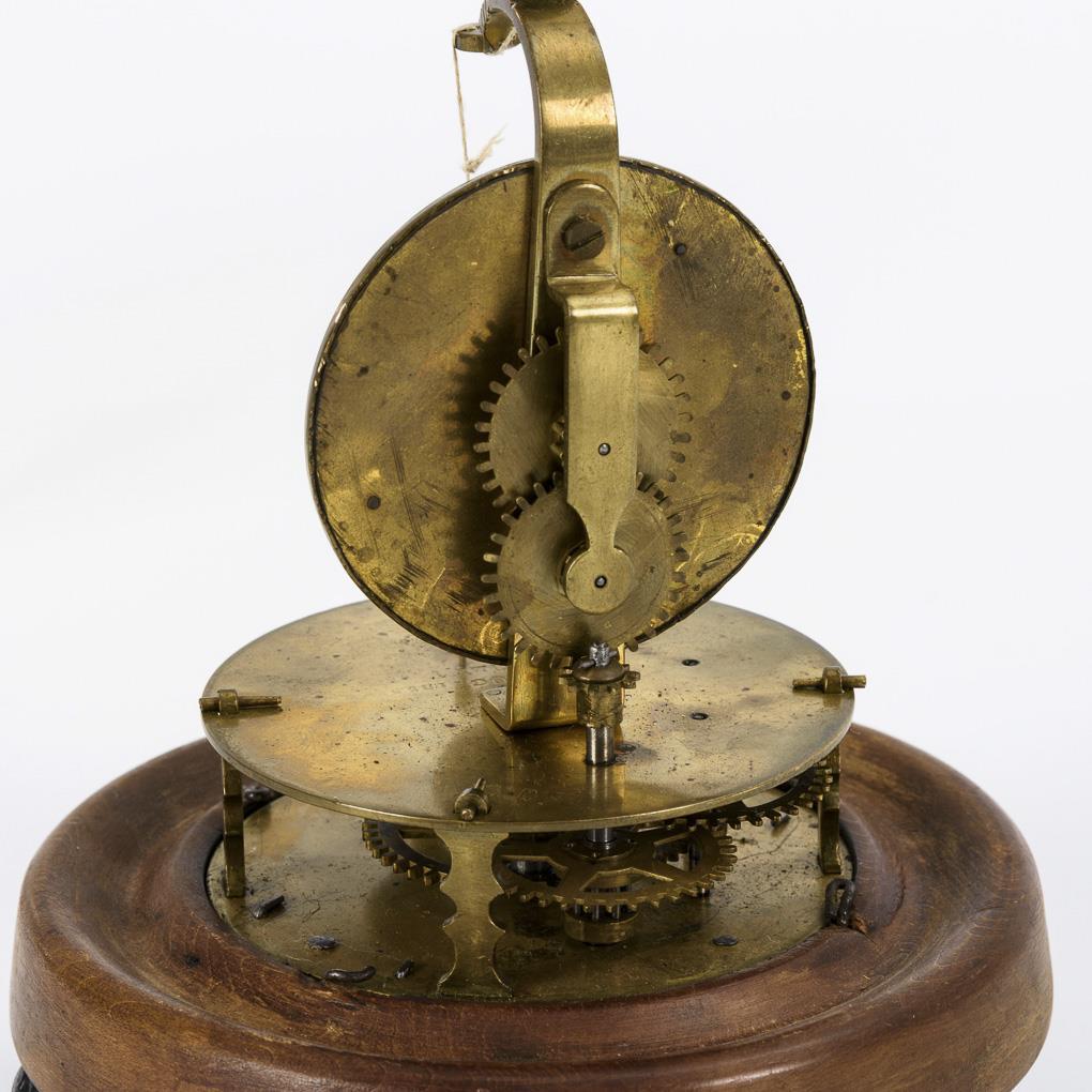 Round beech base on 3 leaf-relief iron feet. Brass plaques, stamped "PAT. AUG. 1855 JULY [...] with gear train, bottom iron wheel manual winding, movement in need of overhaul. Applied dial with front side hanging lead ball as movement drive (thread provisionally repaired). Completed plastic glass fall. Signs of age and use, defects.