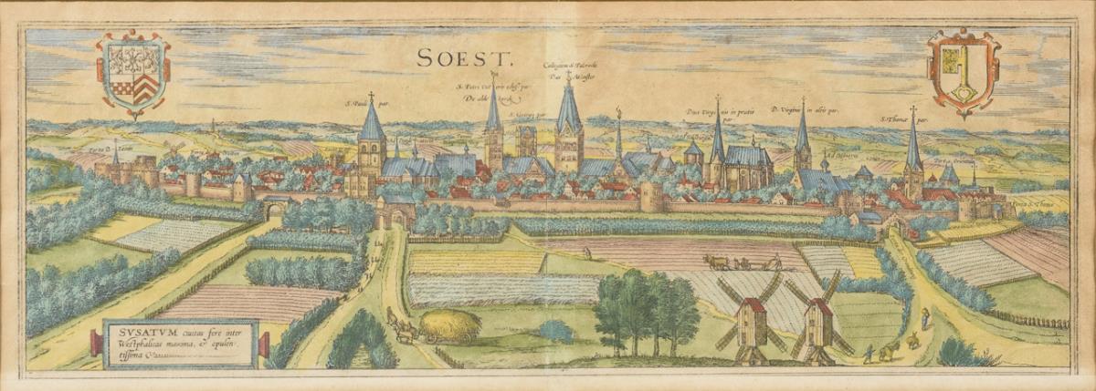 Decorative central perspective depiction of the city of Soest, with title-cartouche "Svstatvm civitas fere inter Westphalicas maxima et opulentissima", from "Civitates Orbis Terrarum", 1572 - 1618. Buckling, light damage, lower margin pasted behind.