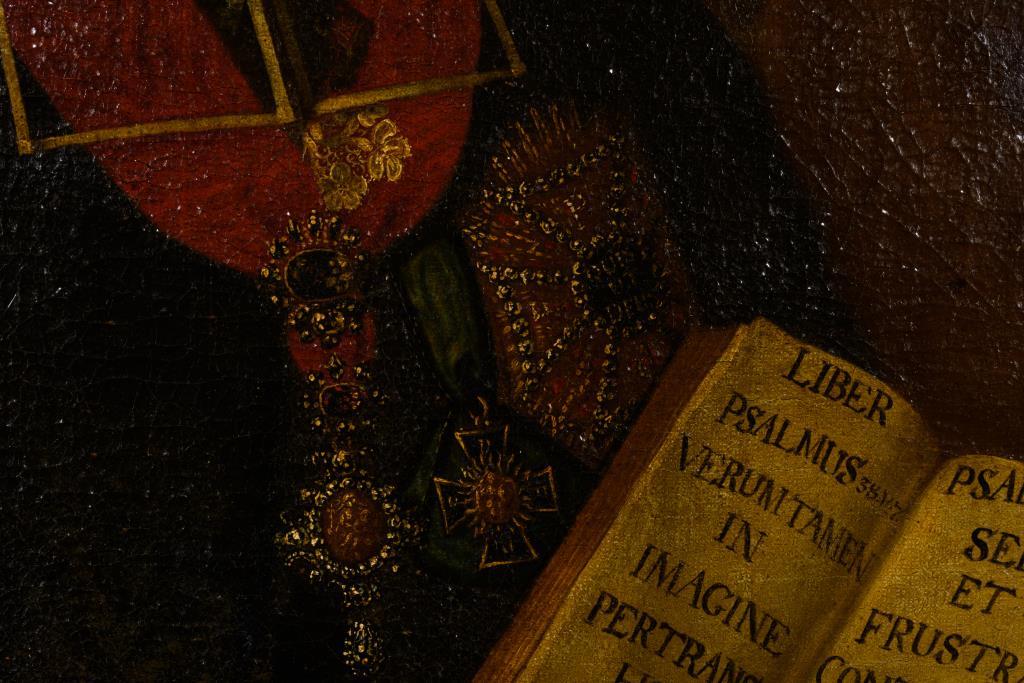 Porträt eines junger Adligen im dunklen Gehrock mit verschiedenen Orden. Leinwand doubliert, Altersspuren.