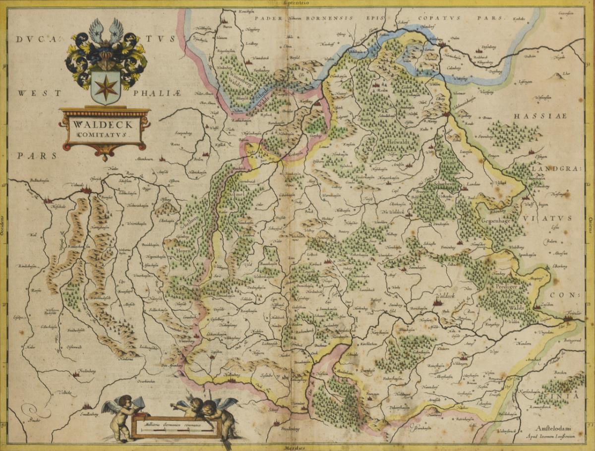 Decorative map of the county Waldeck in today's state Hesse, with title-cartouche "Waldeck Comitatvs". crease, foxing.
