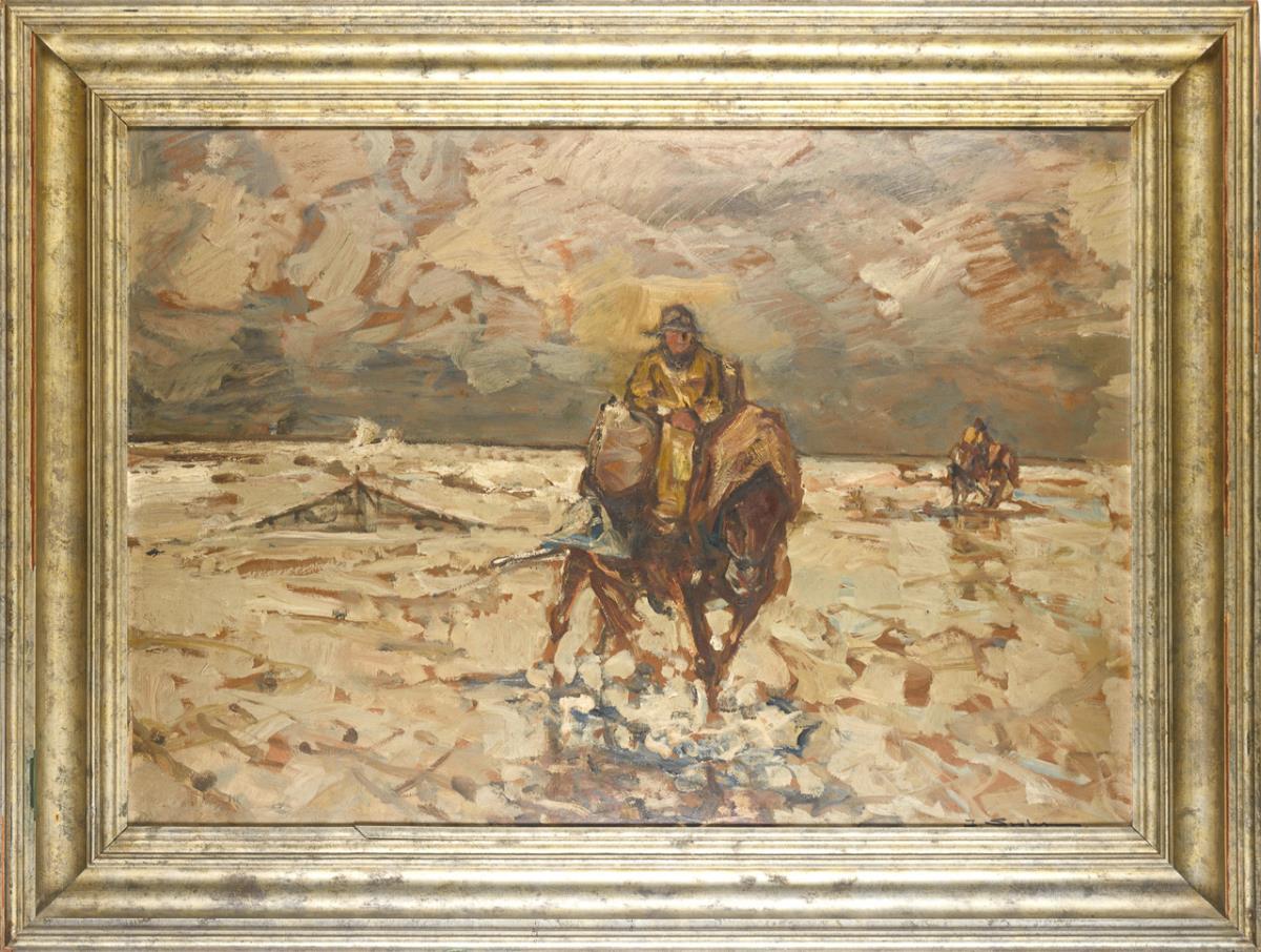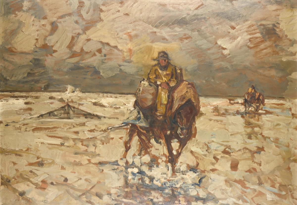 The Men on Horseback on the Beach under Cloudy Sky. Slight signs of age.