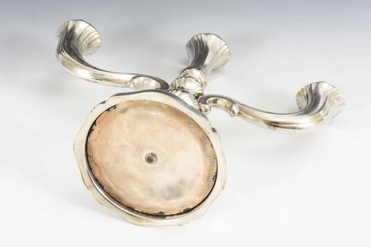 Godroned candelabrum with baluster stem and 2 curved arms. Accompanied by 3 supplemented drip plates of glass. Minimal signs of use.