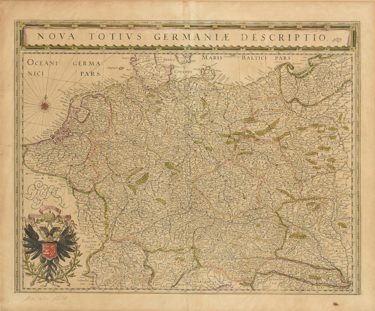 Map of the German Empire with the Netherlands, Germany, Switzerland, Austria, Bohemia, Poland etc. from 1631, inscribed "Nova Totivs Germaniae Descriptio"; probably after an older map by Gerhard Mercator from "Atlas Minor". Buckling, with light damage, small spot in lower right margin.