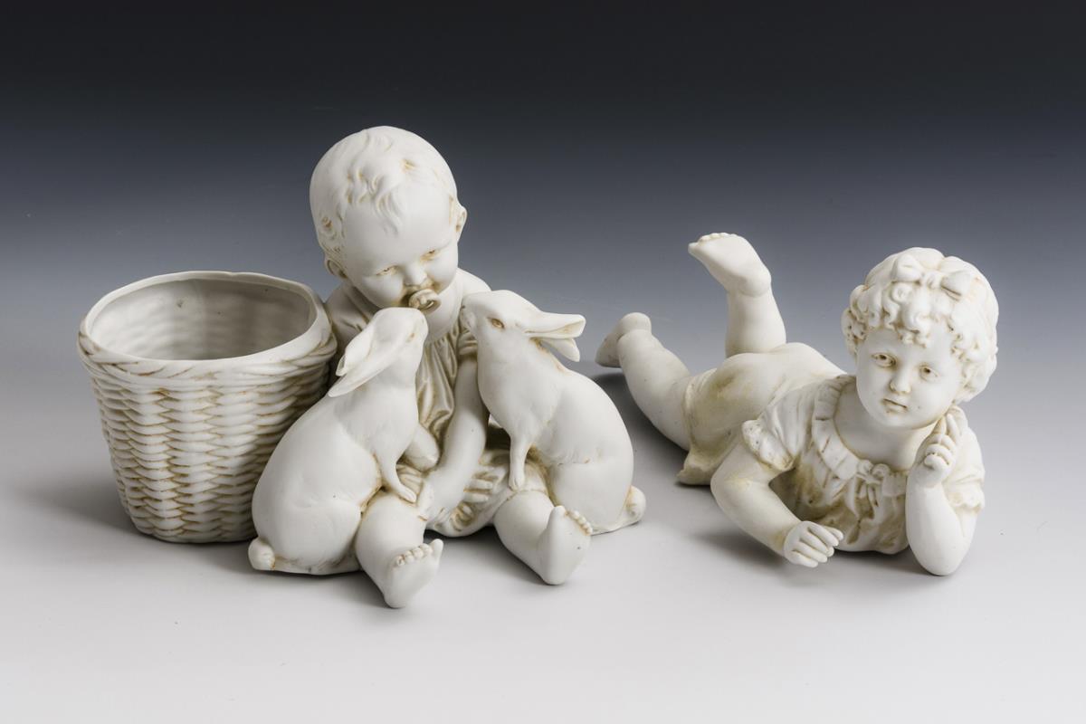 Reclining girl (l 21 cm) and boy sitting at a basket with two hares (h 13.5 cm). / Pair of dachshunds (H 7.5 cm), boy with doll (H 10.5 cm) and boy sitting on a chamber pot (H 11 cm). 1 foot bumped.