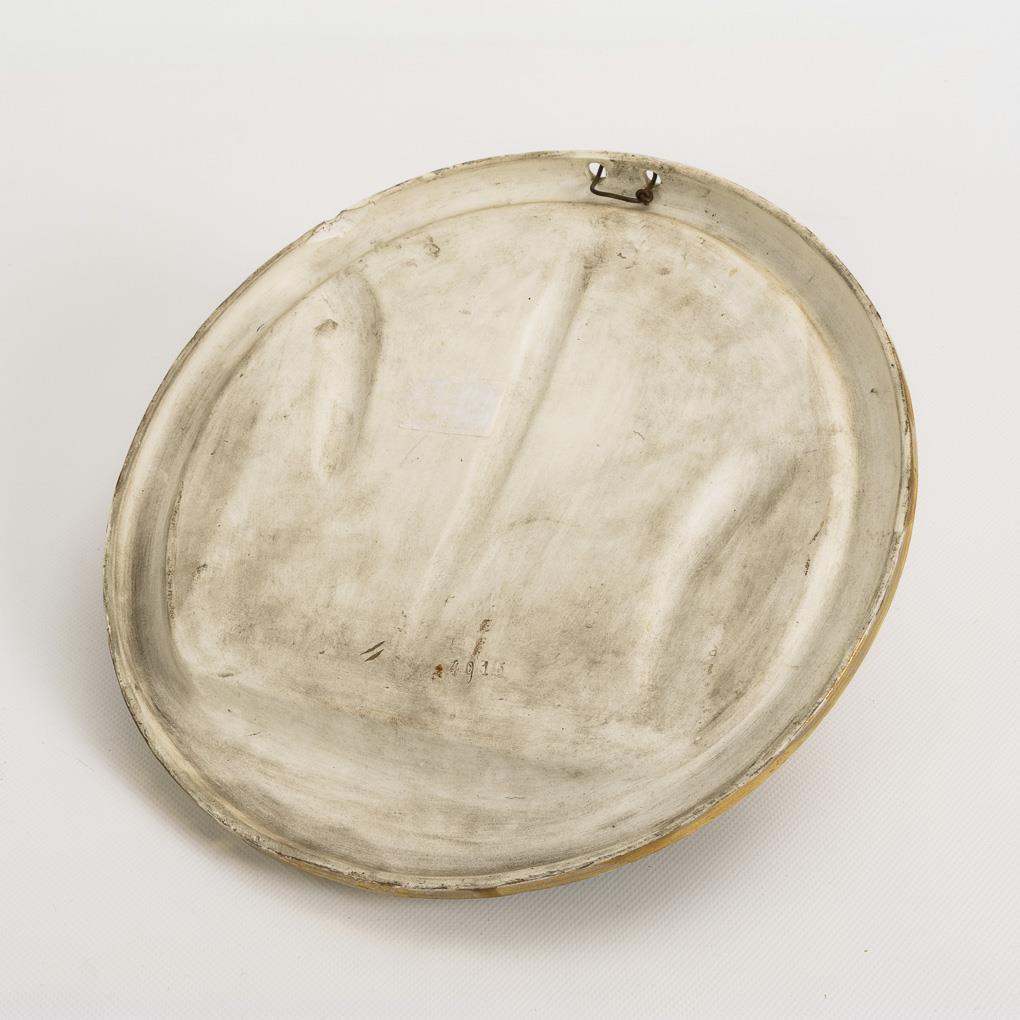 Round historicist wall decorations with partially plastic putti groups and storage bowls in boat form. Slightly gold rubbed.